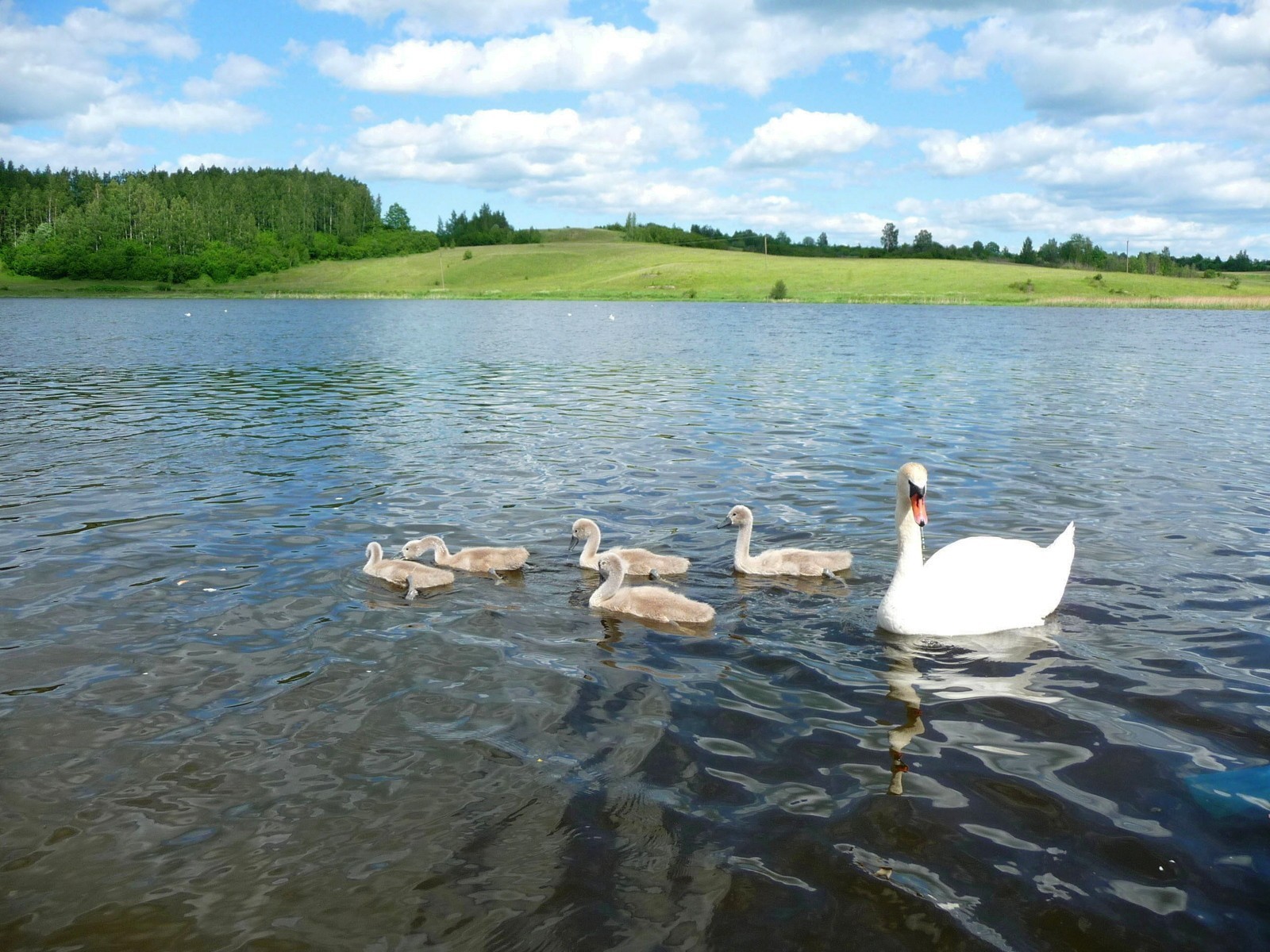 Cinco cisnes nadan juntos en el río hacia la orillaCinco cisnes nadan juntos en el río hacia la orilla