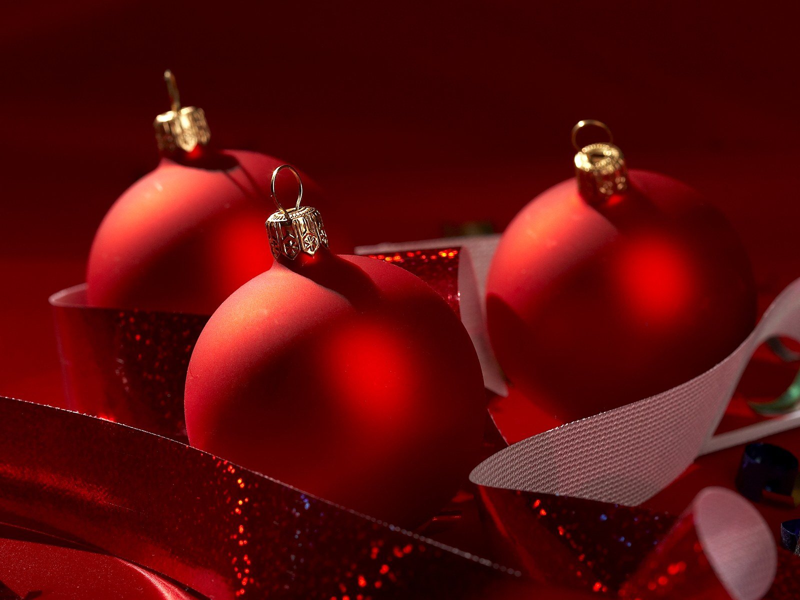 Bolas rojas de año nuevo con cinta sobre fondo rojoBolas rojas de año nuevo con cinta sobre fondo rojo