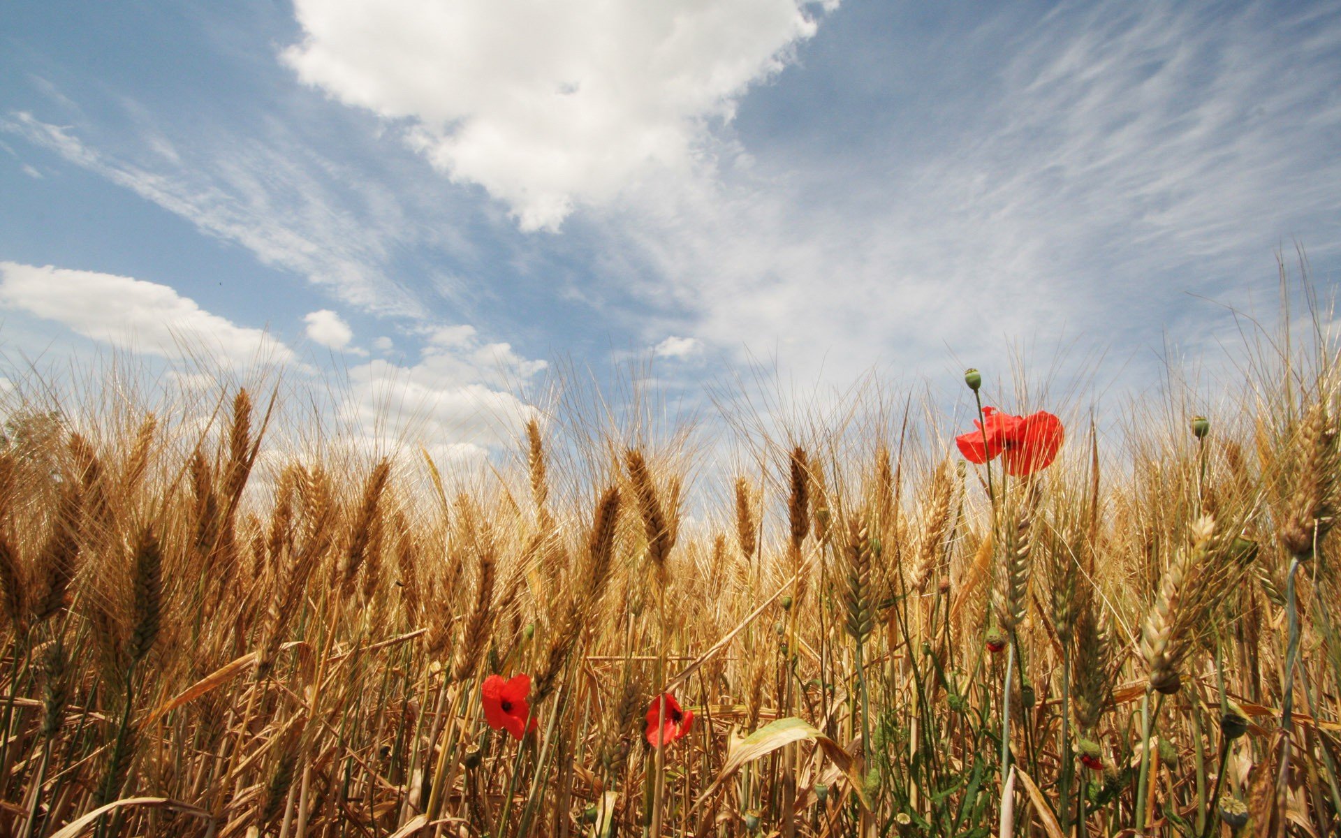 Amapolas y trigo, un tumulto de colores de verano contra el cieloAmapolas y trigo, un tumulto de colores de verano contra el cielo