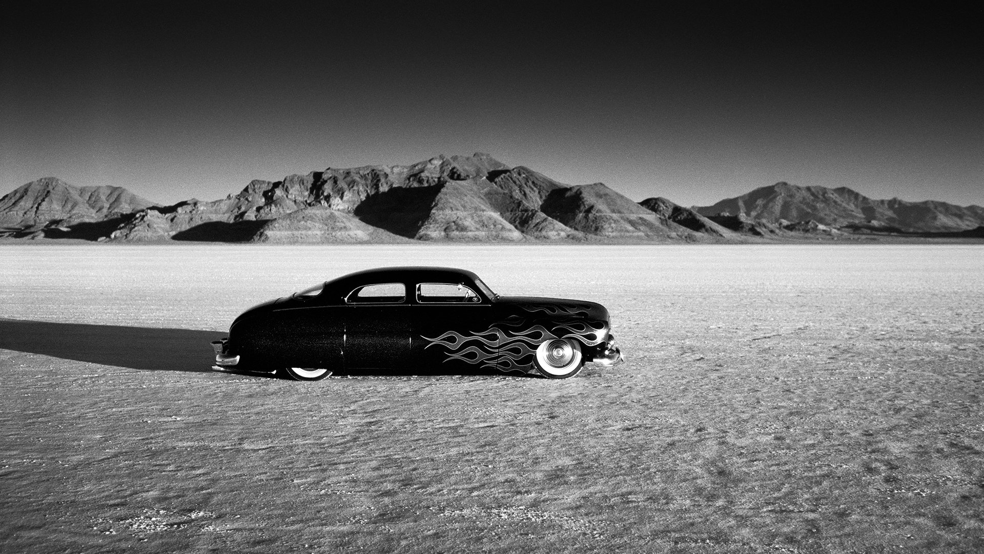 Foto en blanco y negro con un coche de carreras en el fondo de las montañasFoto en blanco y negro con un coche de carreras en el fondo de las montañas