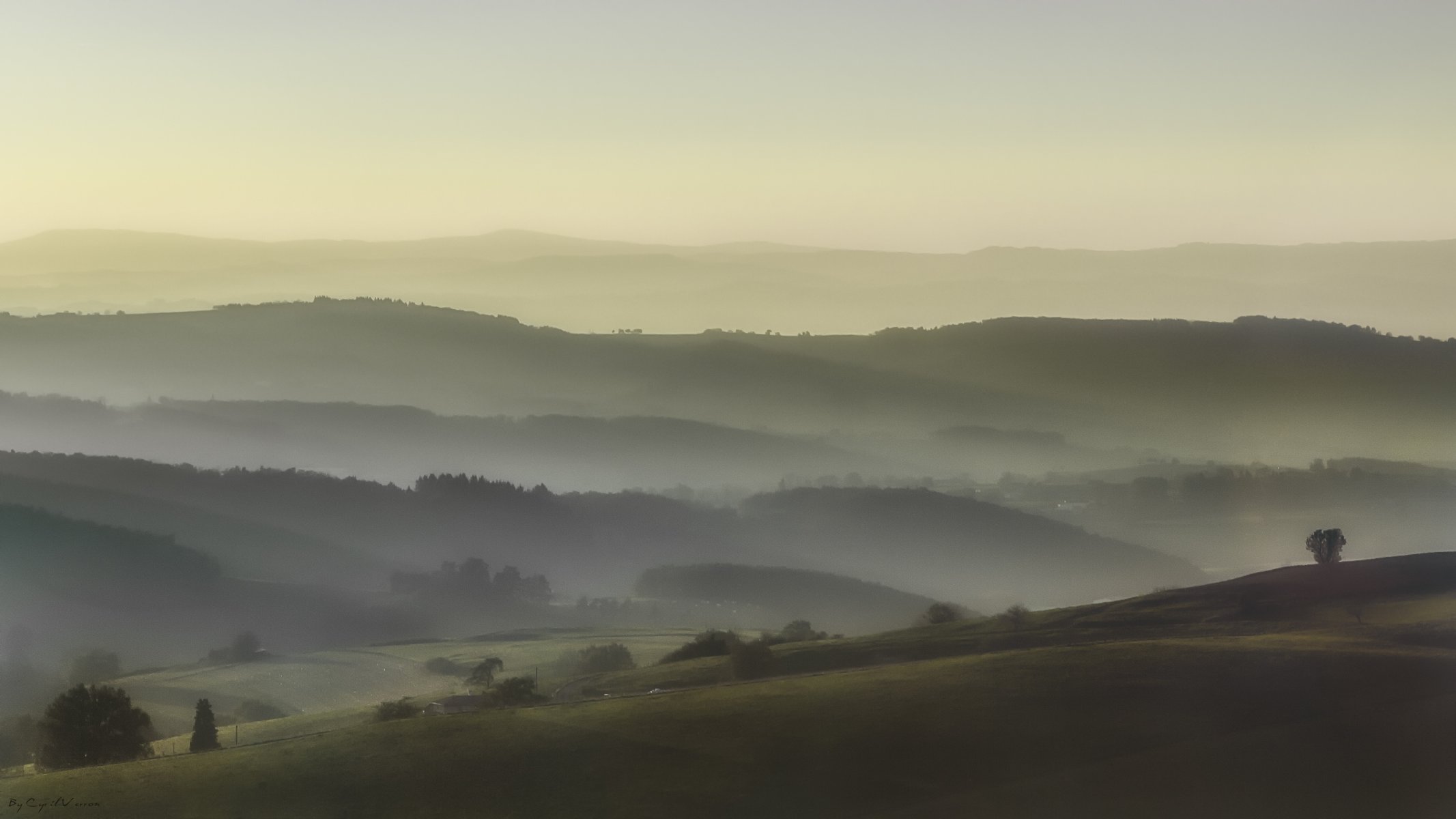 Mañana en italia vista de un campo con colinas y árbolesMañana en Italia vista de un campo con colinas y árboles