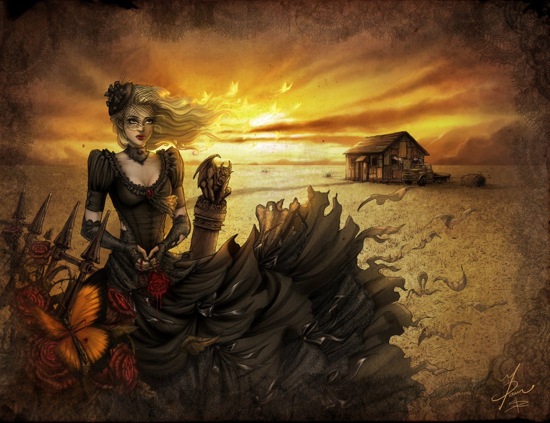 Chica gótica con un vestido negro y un sombrero en el fondo de la casa y el atardecerChica gótica con un vestido negro y un sombrero en el fondo de la casa y el atardecer