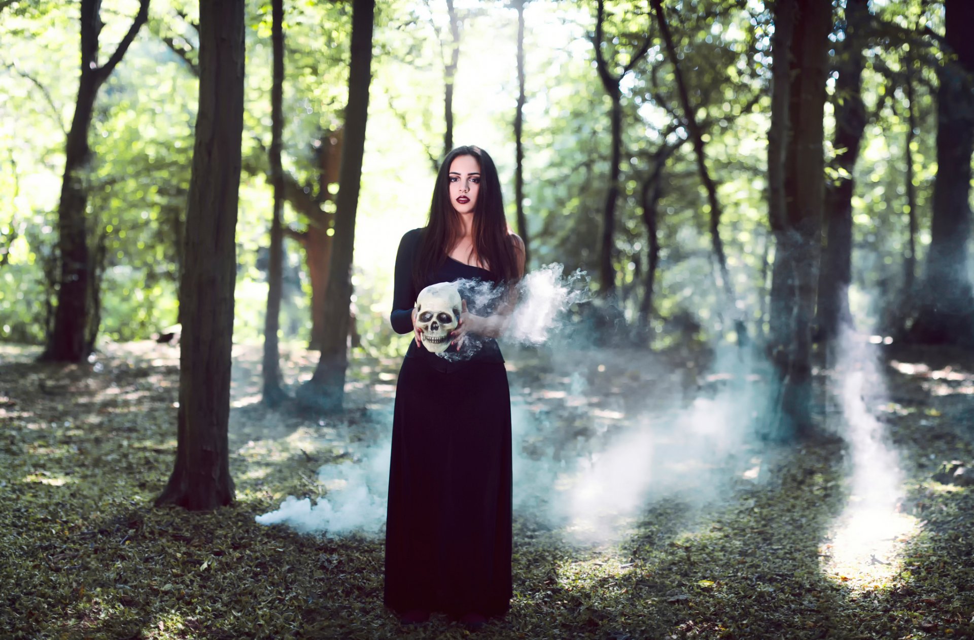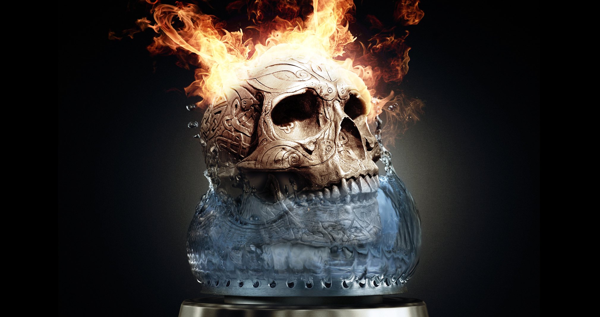 Un monstruo con ojos ardientes y cráneos voladores en la oscuridad