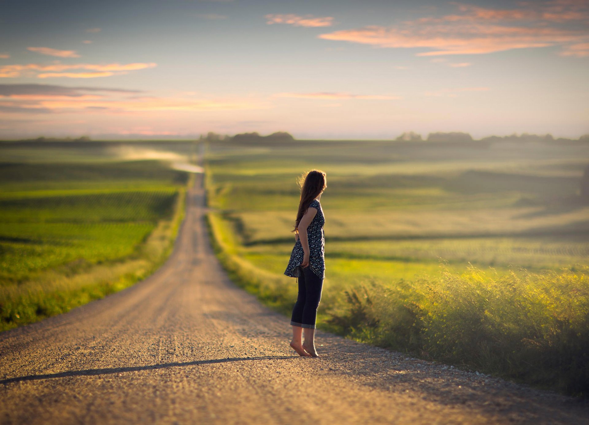 Rubia de pie en un prado contra un árbol solitario y un cielo azulRubia de pie en un Prado contra un árbol solitario y un cielo azul