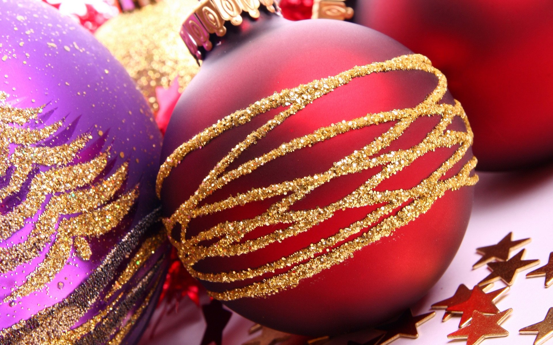 Bolas rojas de Navidad y la parte superior del árbol de Navidad entre oropel