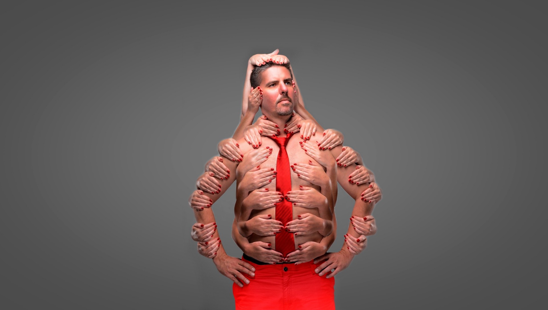 Foto macro de la cara y las manos con lápiz labial rojo y esmalte de uñasFoto macro de la cara y las manos con lápiz labial rojo y esmalte de uñas