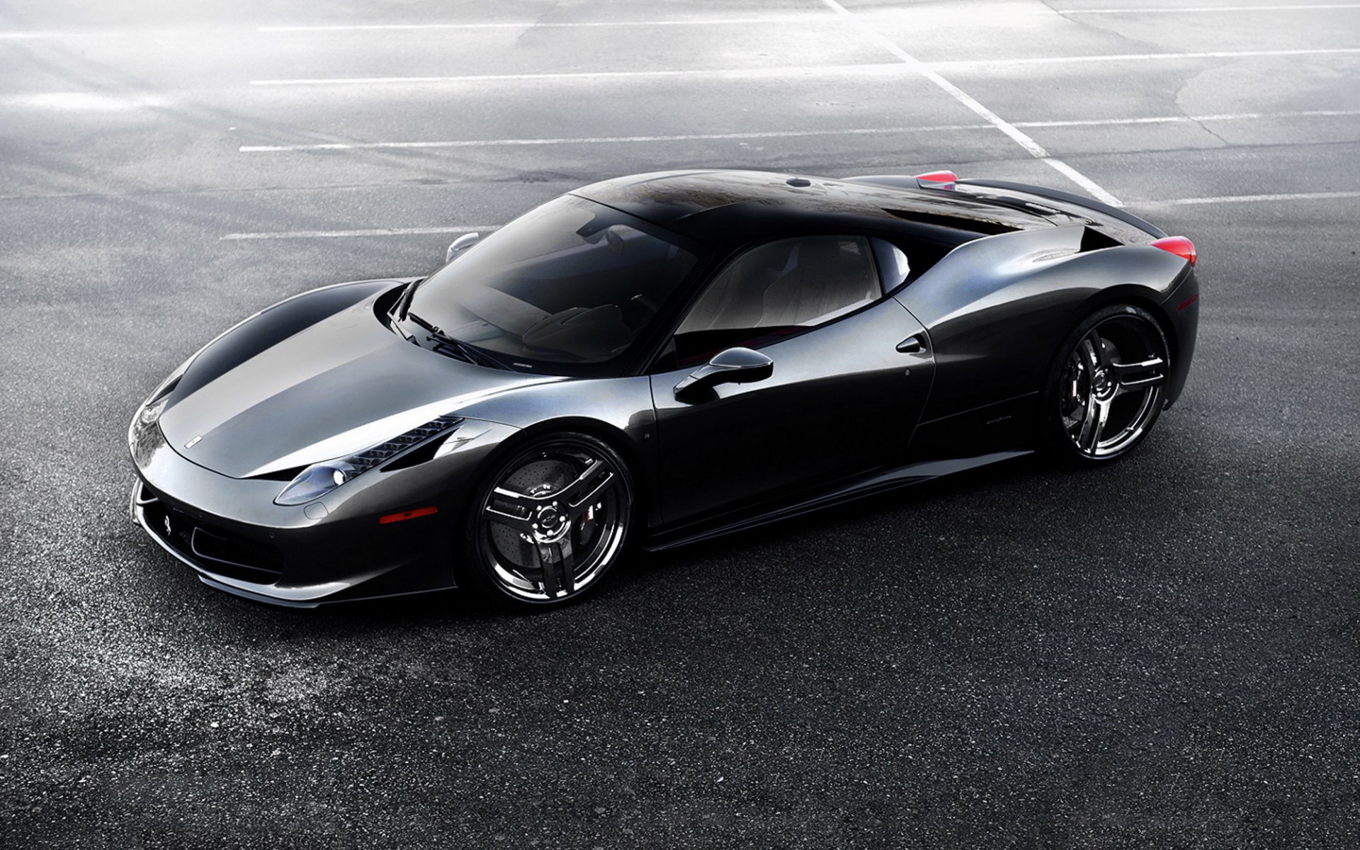 Superdeportivo negro ferrari 458 en asfalto vista lateralSuperdeportivo negro ferrari 458 en asfalto vista lateral