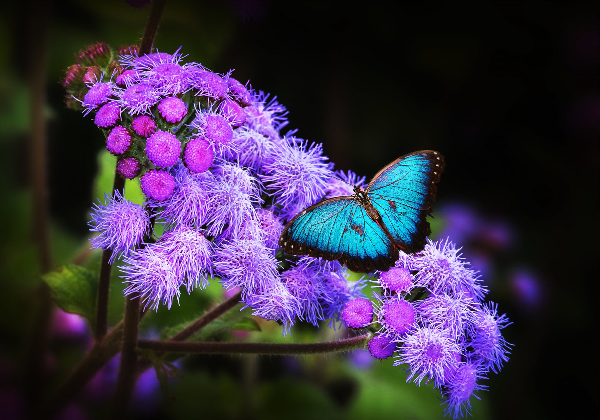 Fotos exóticas de mariposas en flores. Mariposa azul y flores púrpuras