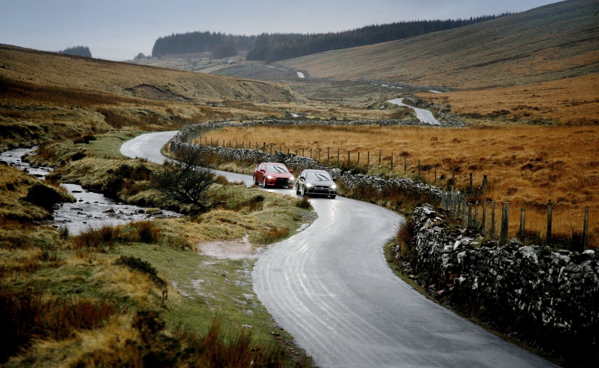 Mitsubishi lancer evo en una carretera gris y tristeMitsubishi lancer evo en una carretera gris y triste