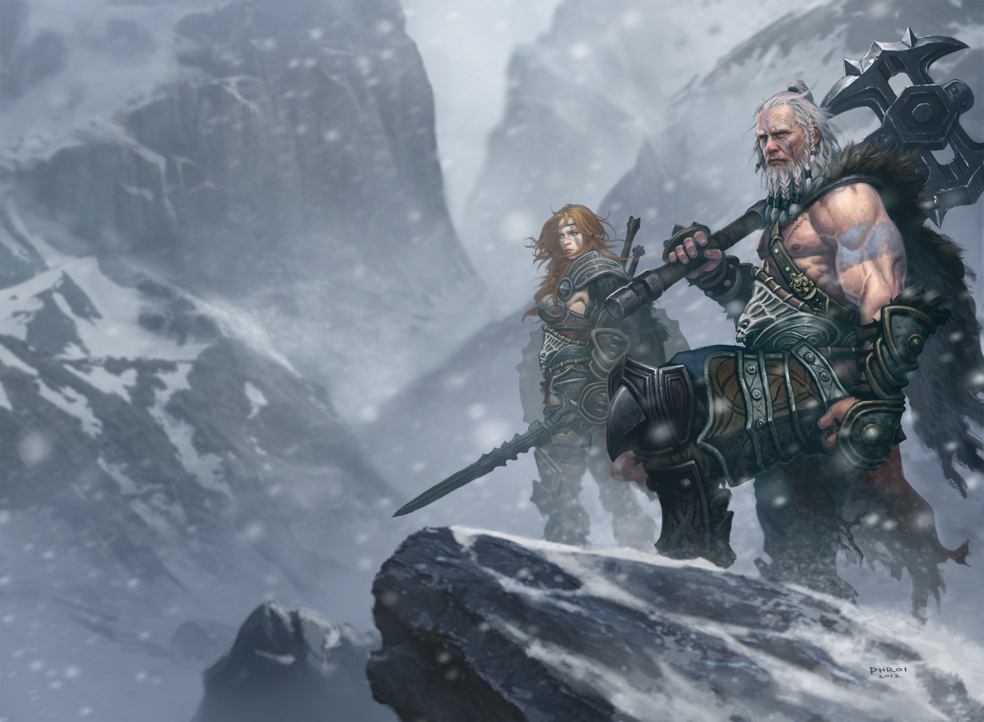El hacha de dos manos del bárbaro en las montañas