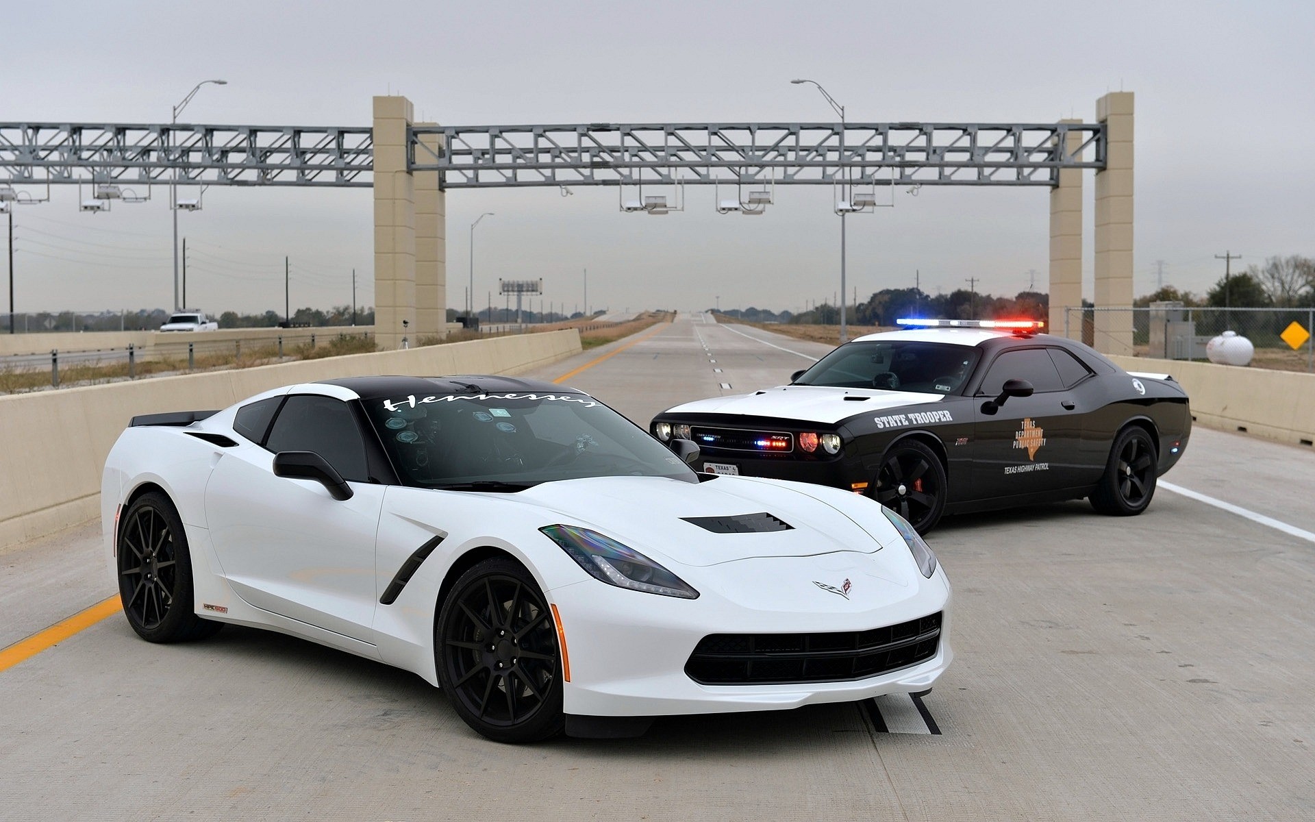 Dos coches deportivos en la pista. Corvette de carreras y policía blanca