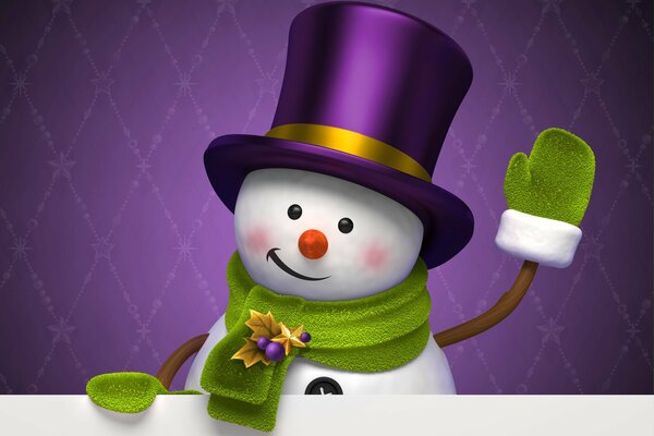 Muñeco de nieve de año nuevo con sombrero púrpura y mitones verdes