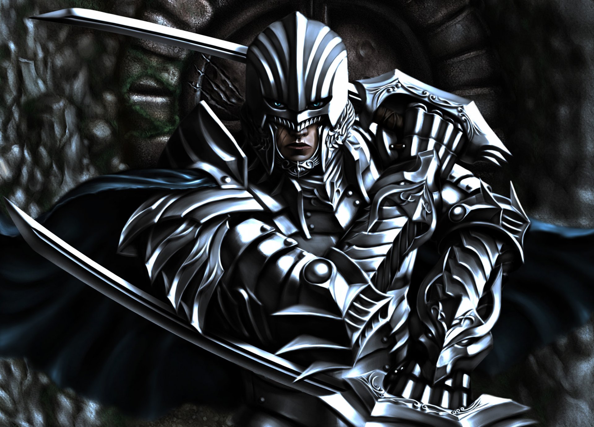 El guerrero está vestido con armadura y casco, con cuchillas largasEl guerrero está vestido con armadura y casco, con cuchillas largas