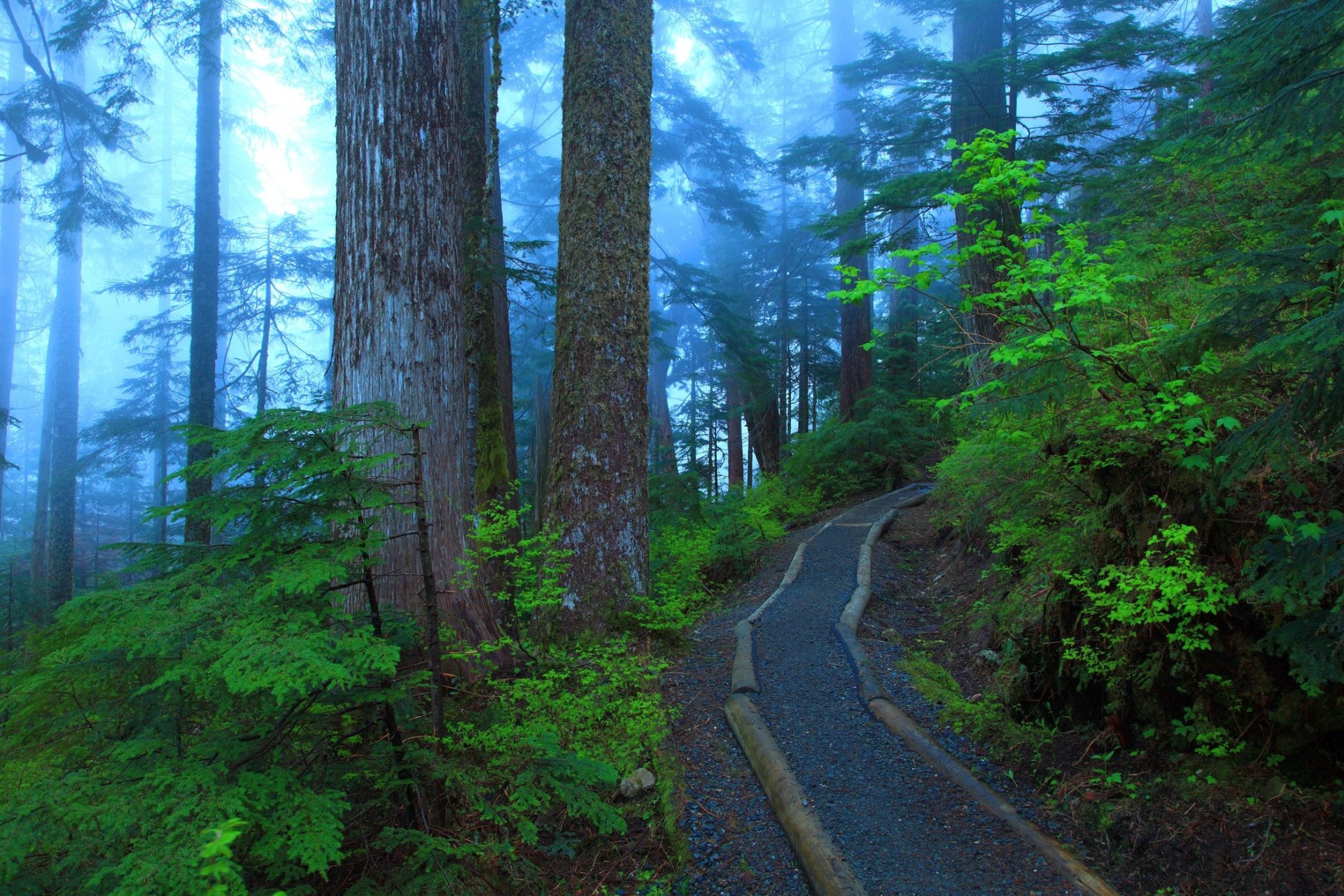 Sendero en el parque en medio del bosque de nieblaSendero en el parque en medio del bosque de niebla