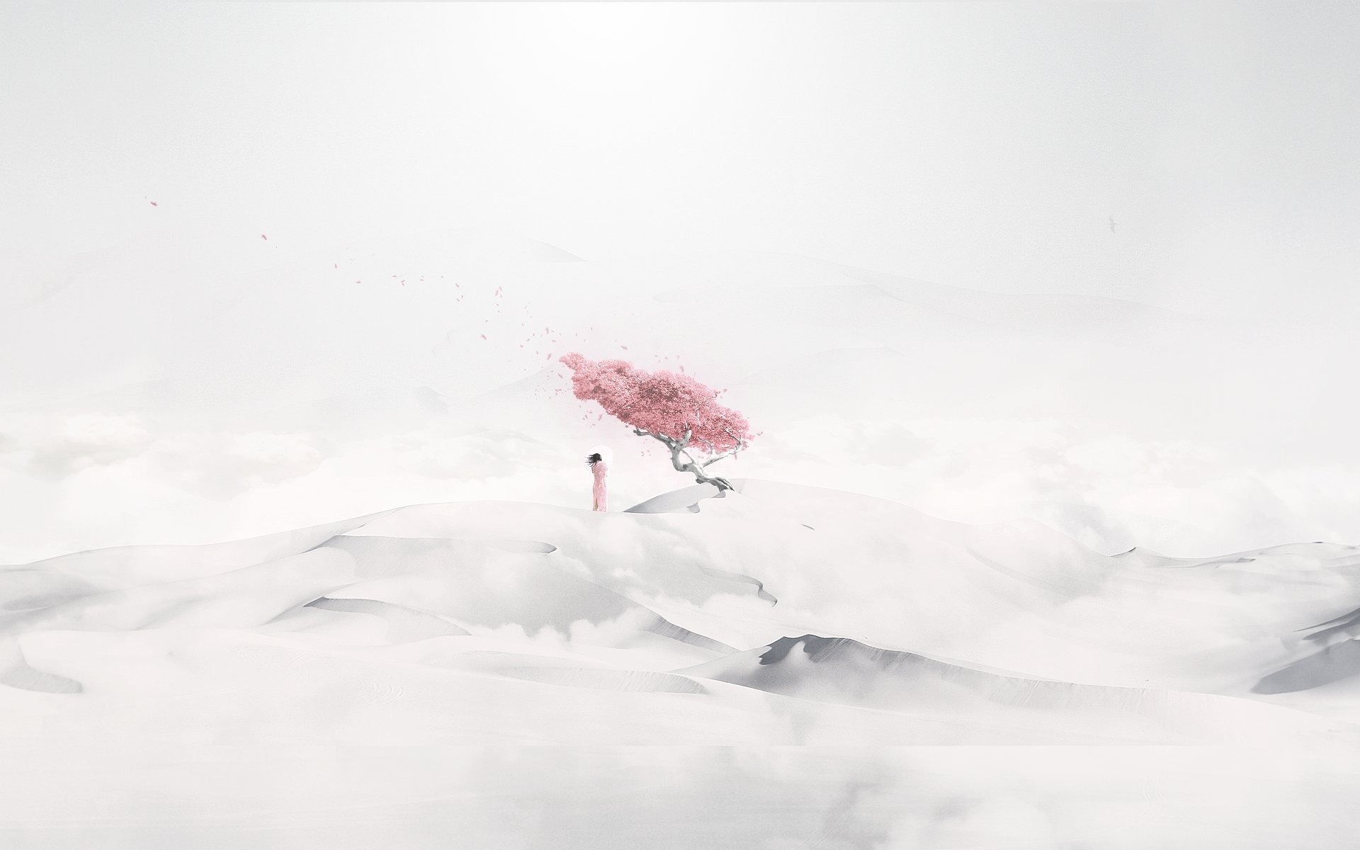 Chica bajo un árbol en el desierto blanco