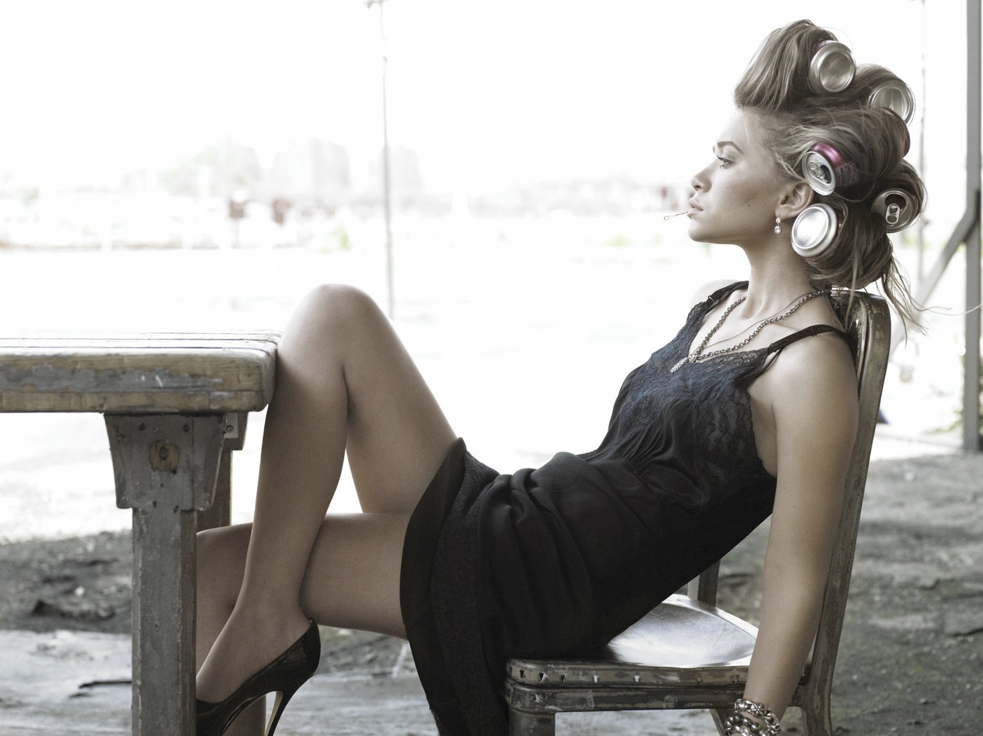 Elizabeth olsen en la silla. pierna a pierna. cerca de la mesaElizabeth Olsen en la silla. Pierna a pierna. Cerca de la mesa