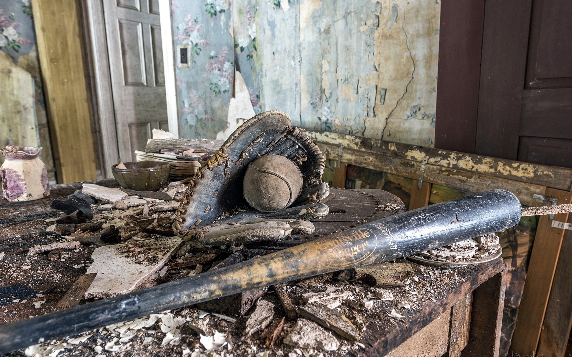 Bate de béisbol, guante y pelota en casa destruidaBate de béisbol, guante y pelota en casa destruida