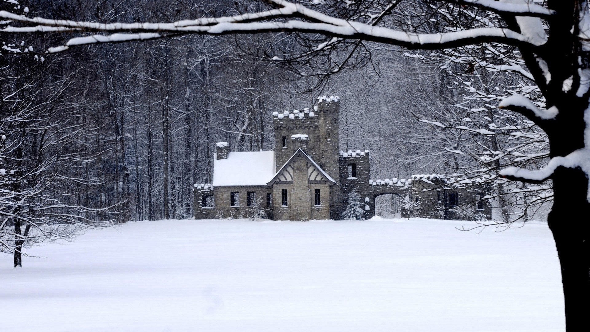 En el bosque de invierno se encuentra una casa de piedra de luz brillante mano sosteniendo una medallaEn el bosque de invierno se encuentra una casa de piedra de luz brillante mano sosteniendo una medalla