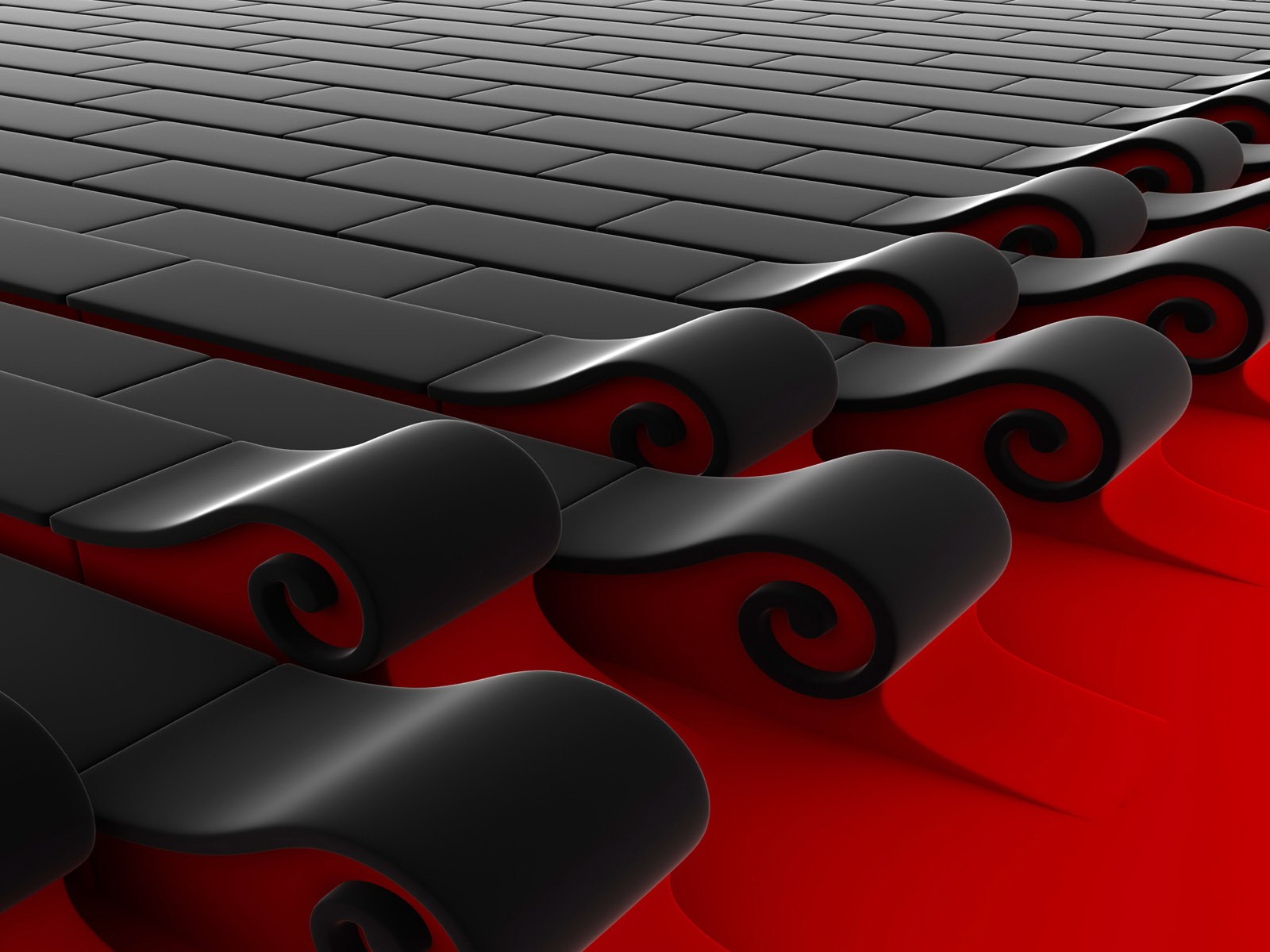Azulejos negros en forma de ondas cubren el fondo rojoAzulejos negros en forma de ondas cubren el fondo rojo