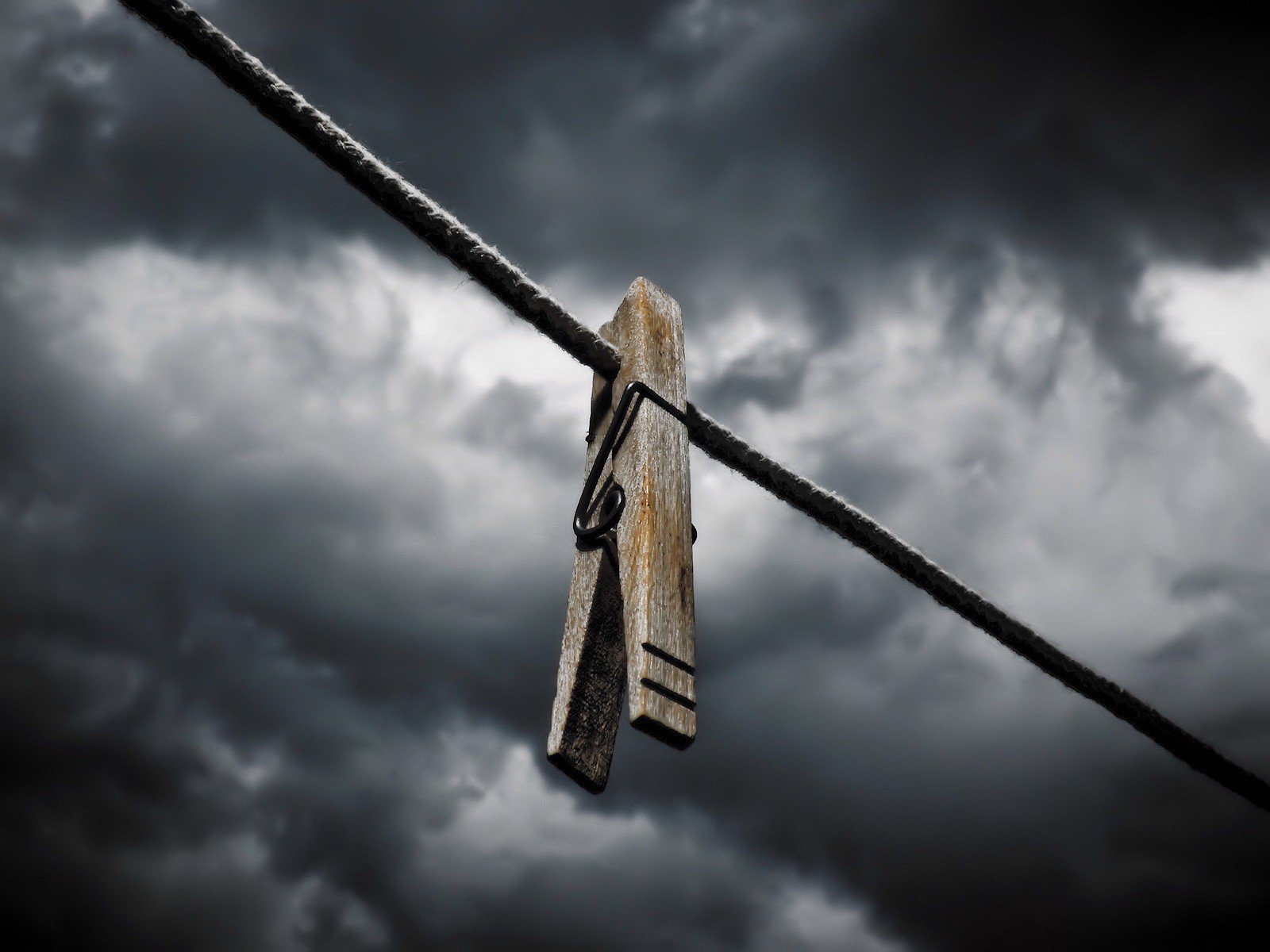 Pinza de ropa en una cuerda en medio de nubes sombríasPinza de ropa en una cuerda en medio de nubes sombrías