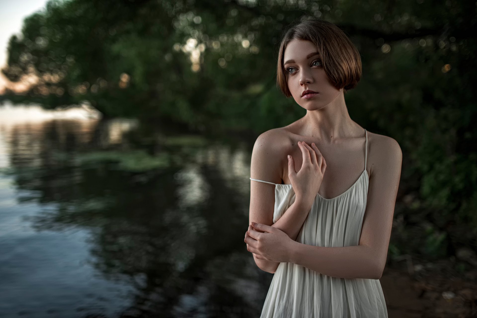 Pelirroja linda chica con el desarrollo del pelo y vestido de floresPelirroja linda chica con el desarrollo del pelo y vestido de flores