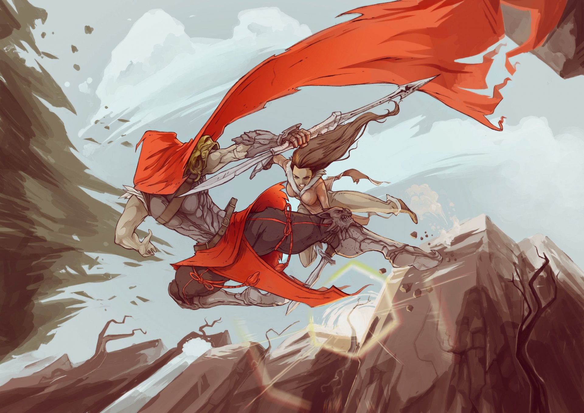 Dibujo de la batalla de dos guerreros en las montañasDibujo de la batalla de dos guerreros en las montañas