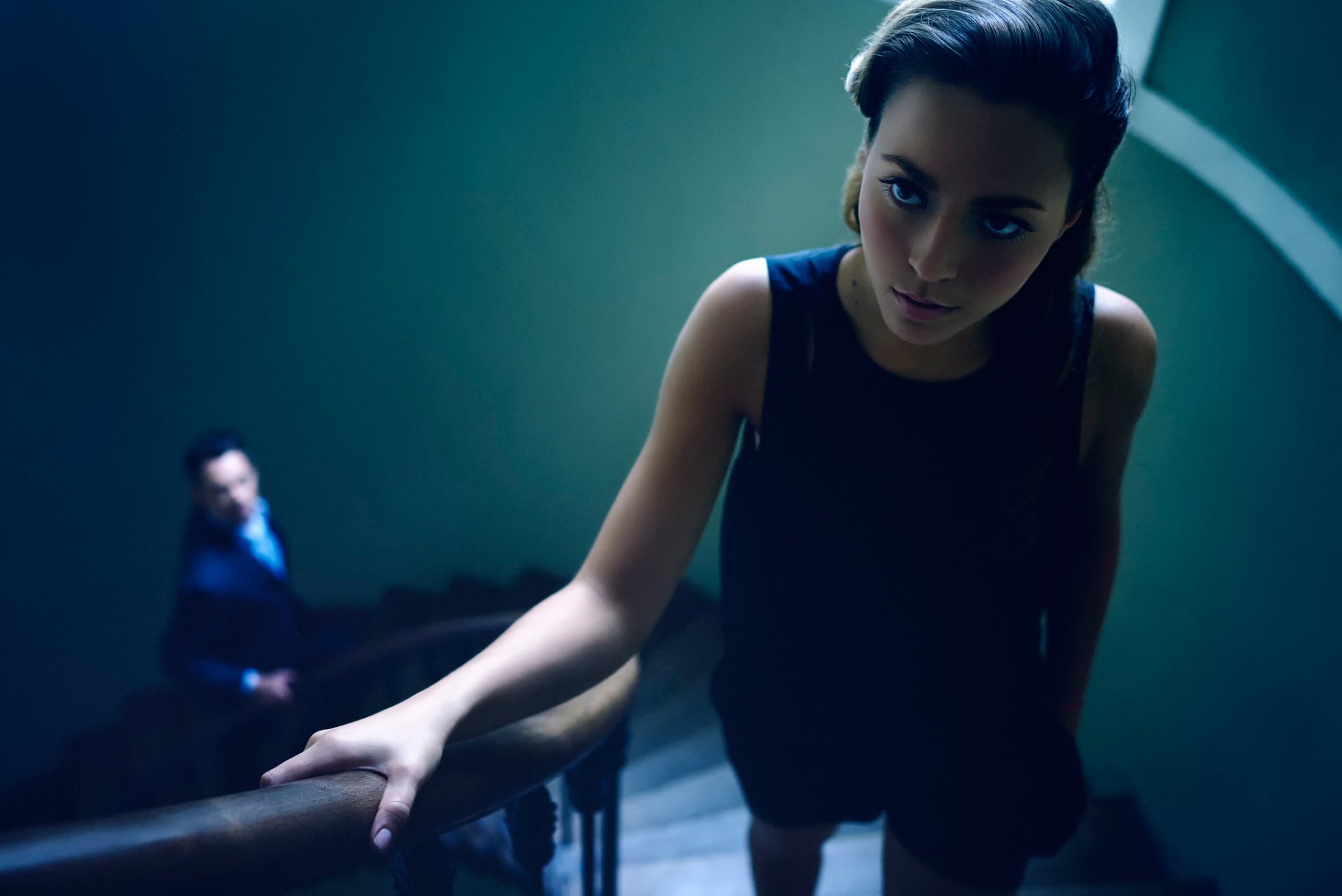 Pelirroja niñera en zapatillas de deporte en las escalerasPelirroja Niñera en Zapatillas de deporte en las escaleras