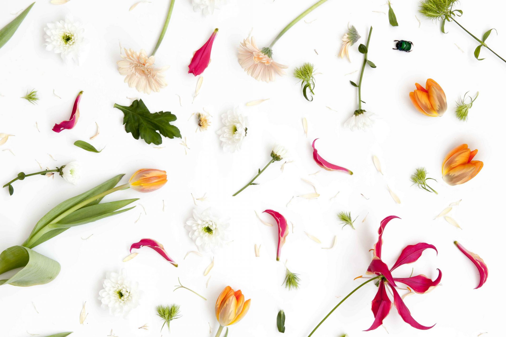 Pétalos de flores en el follaje del escarabajo