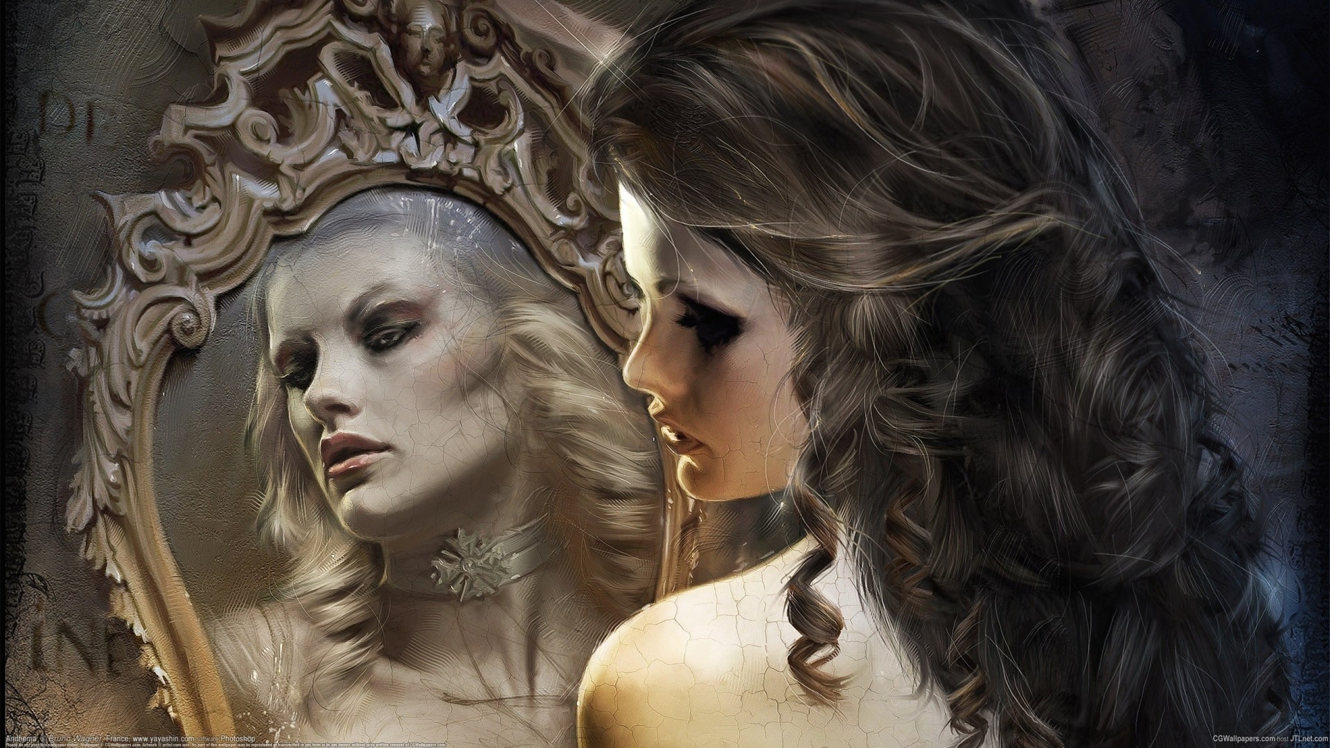 Modelo semidesnuda sentada en una mesa junto al espejoModelo semidesnuda sentada en una mesa junto al espejo