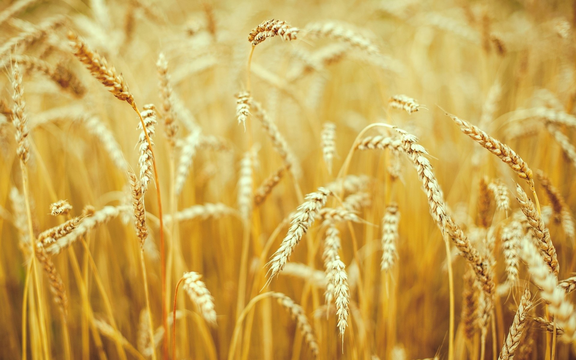 Fotografía macro de espigas. Casa borrosa en el fondo