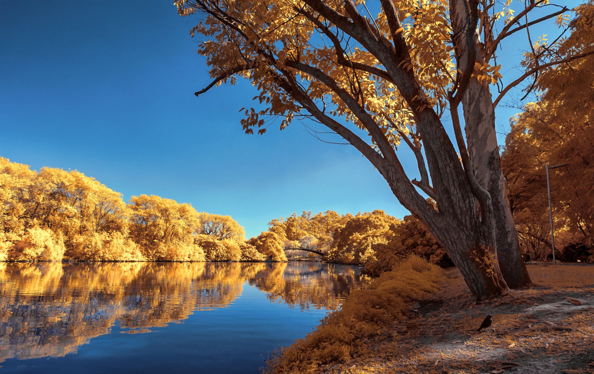 Parque de otoño con árboles y estanque