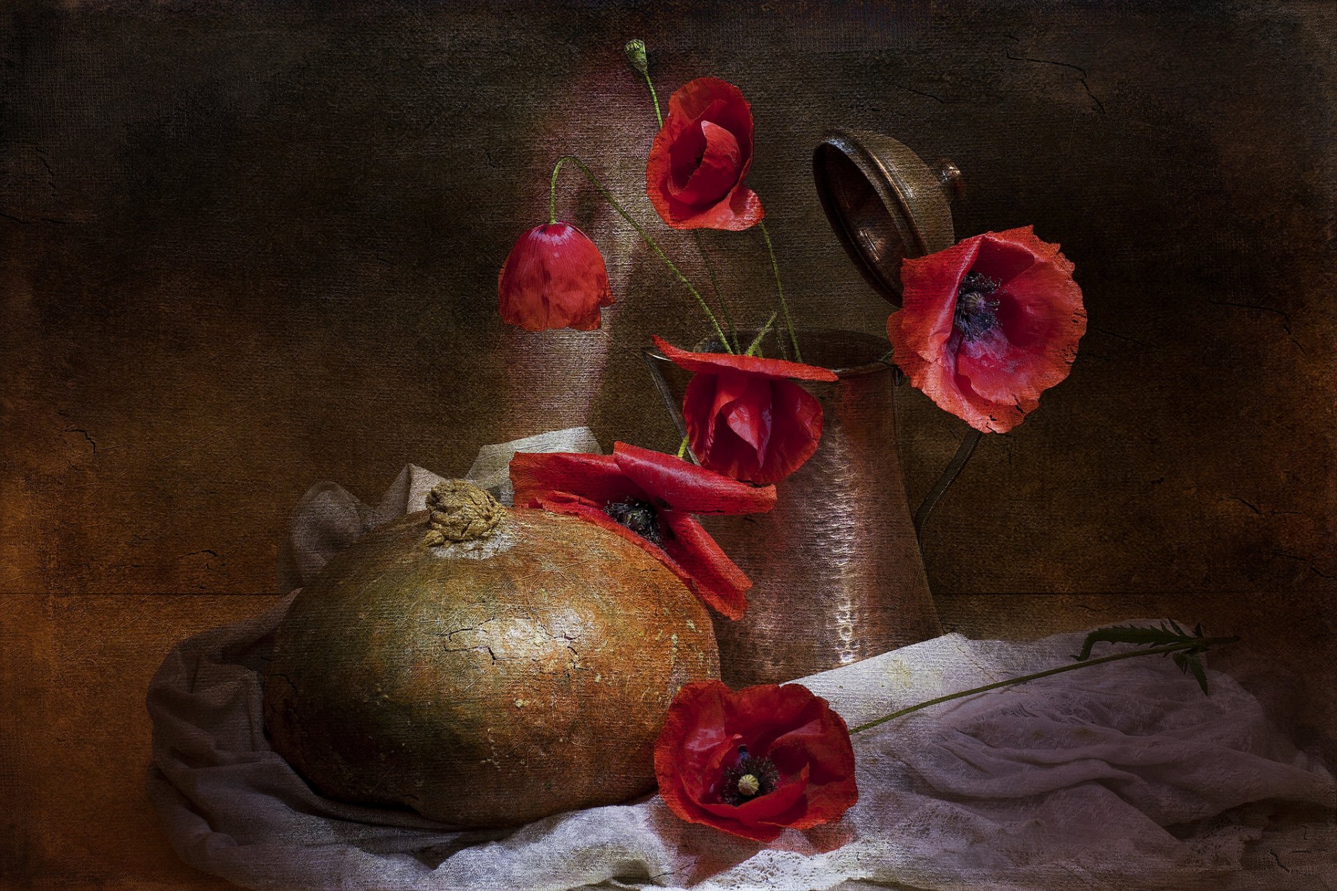 Bodegón de estilo vintage con jarra, amapolas y calabazaBodegón de estilo Vintage con jarra, amapolas y calabaza