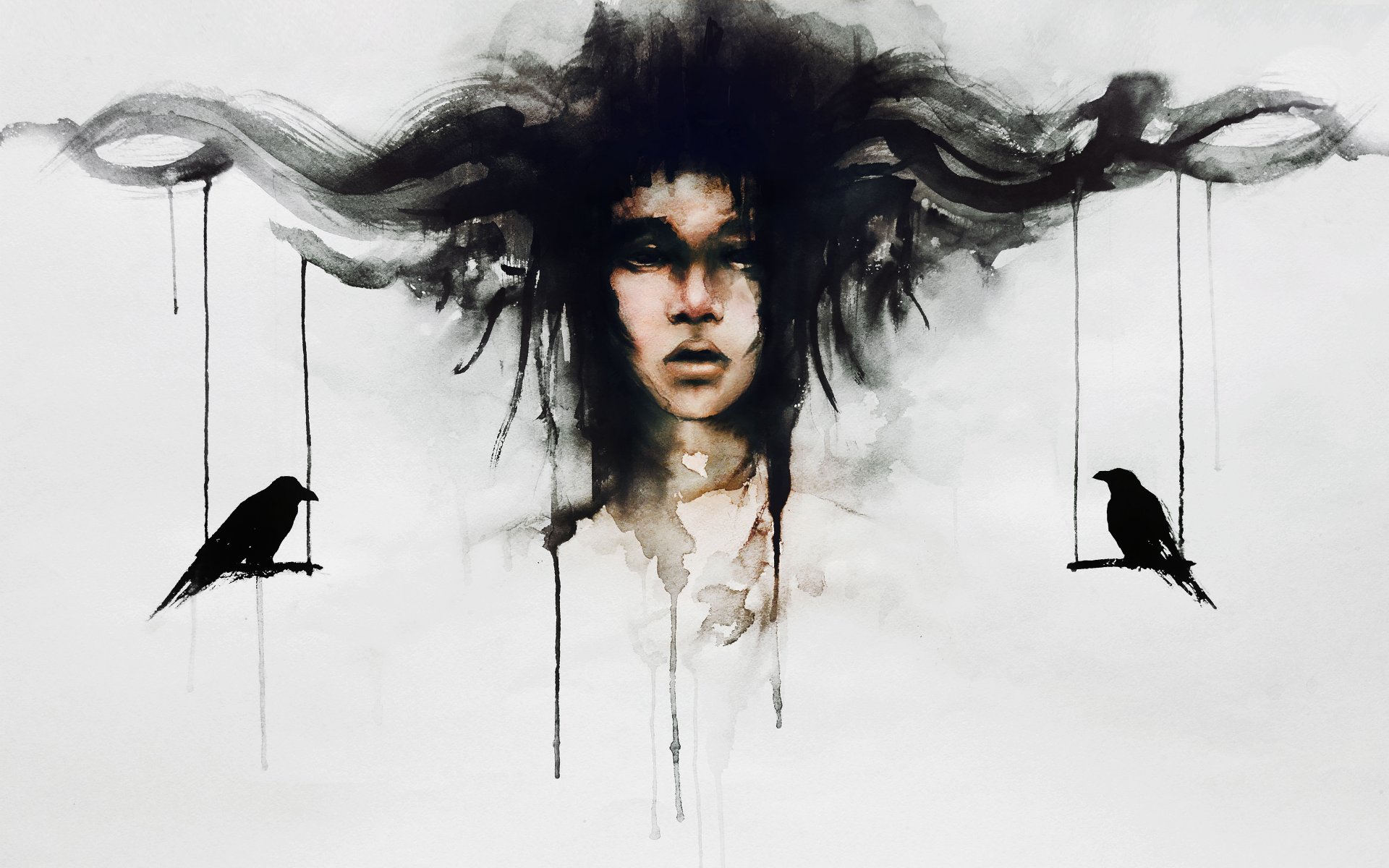 Retrato de una chica con el pelo negro en forma de un columpio y un cuervo sentado en ellosRetrato de una chica con el pelo negro en forma de un columpio y un Cuervo sentado en ellos