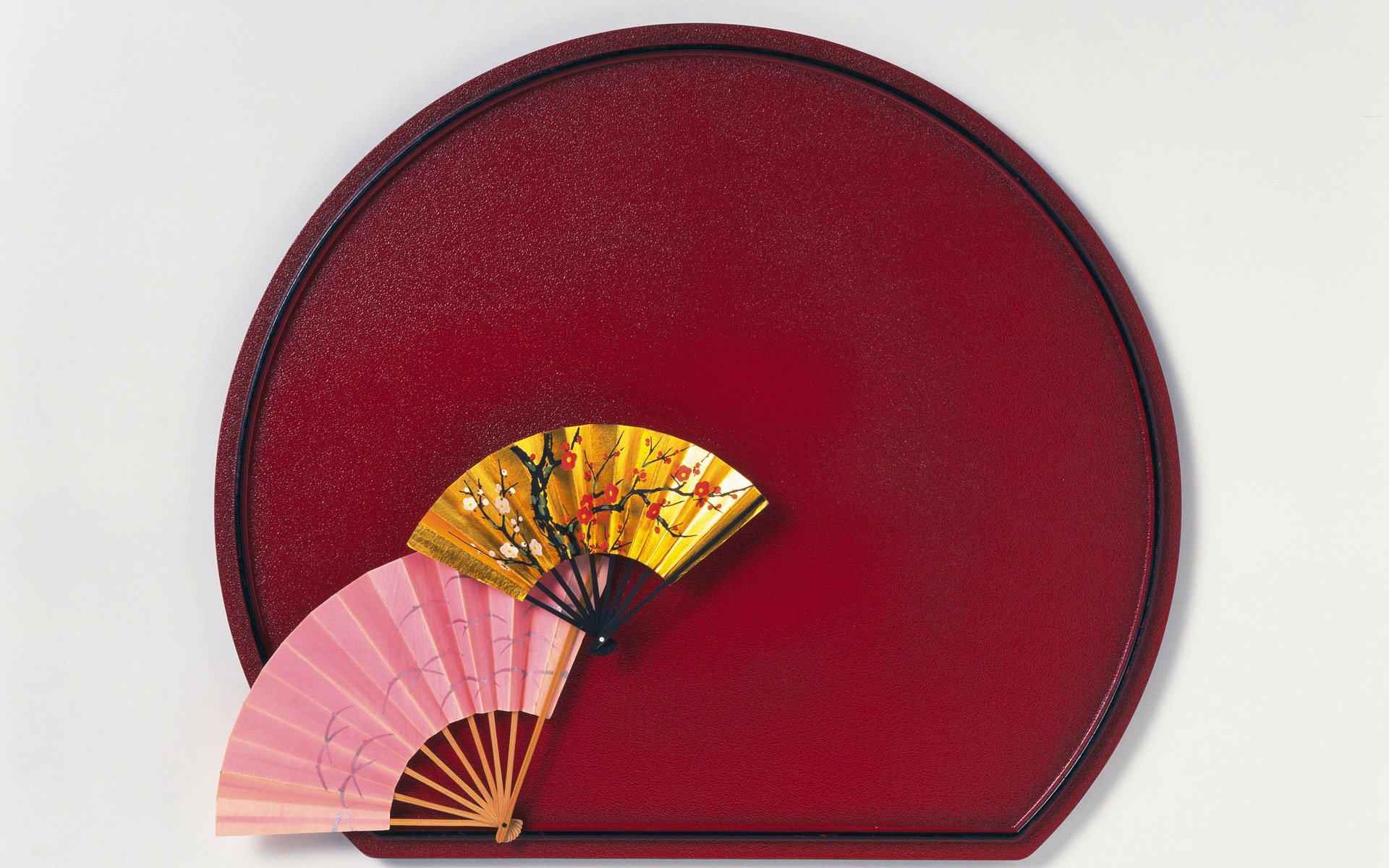 Ventiladores de estilo chino sobre fondo Burdeos