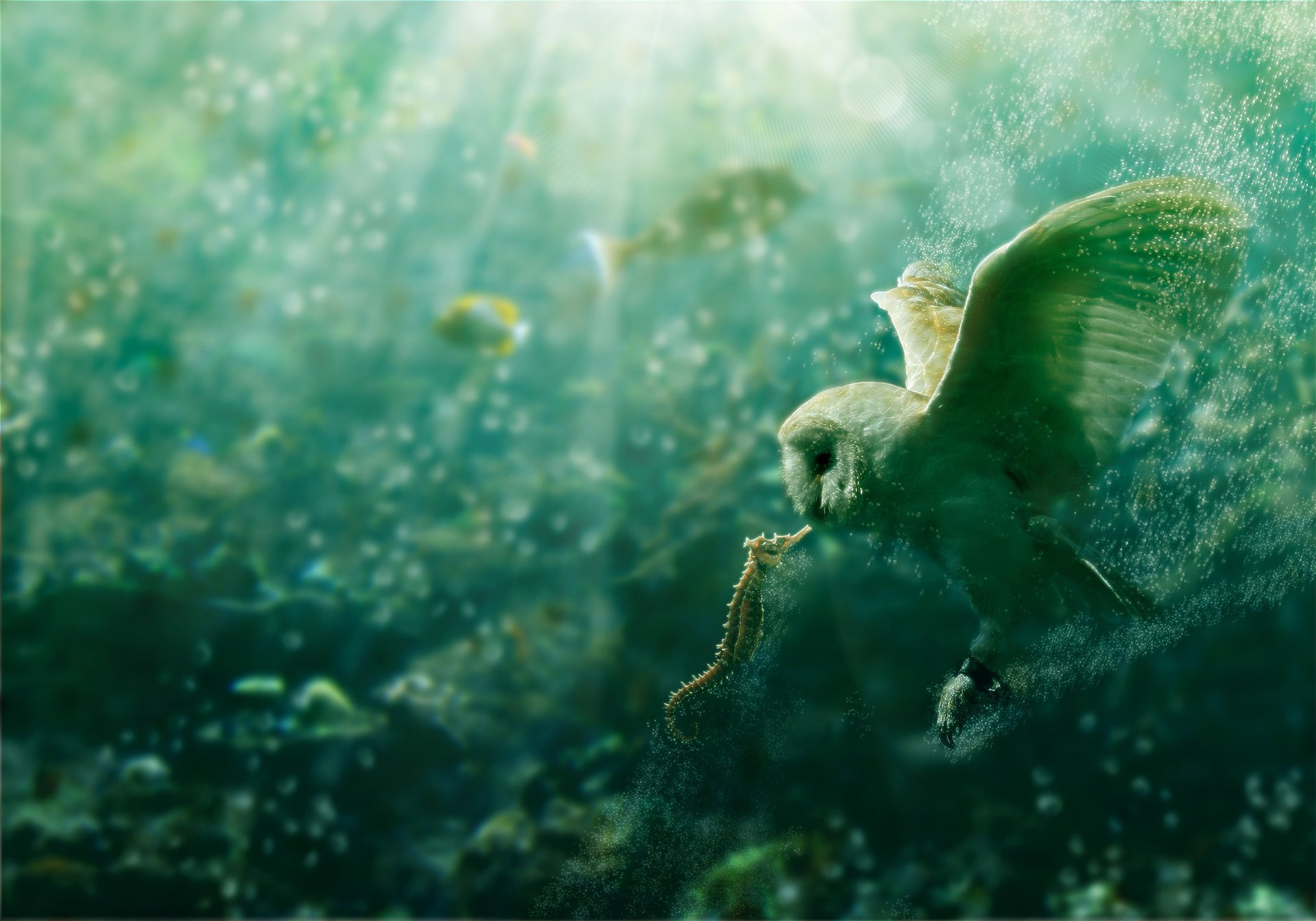 Búho y caballito de mar bajo el agua