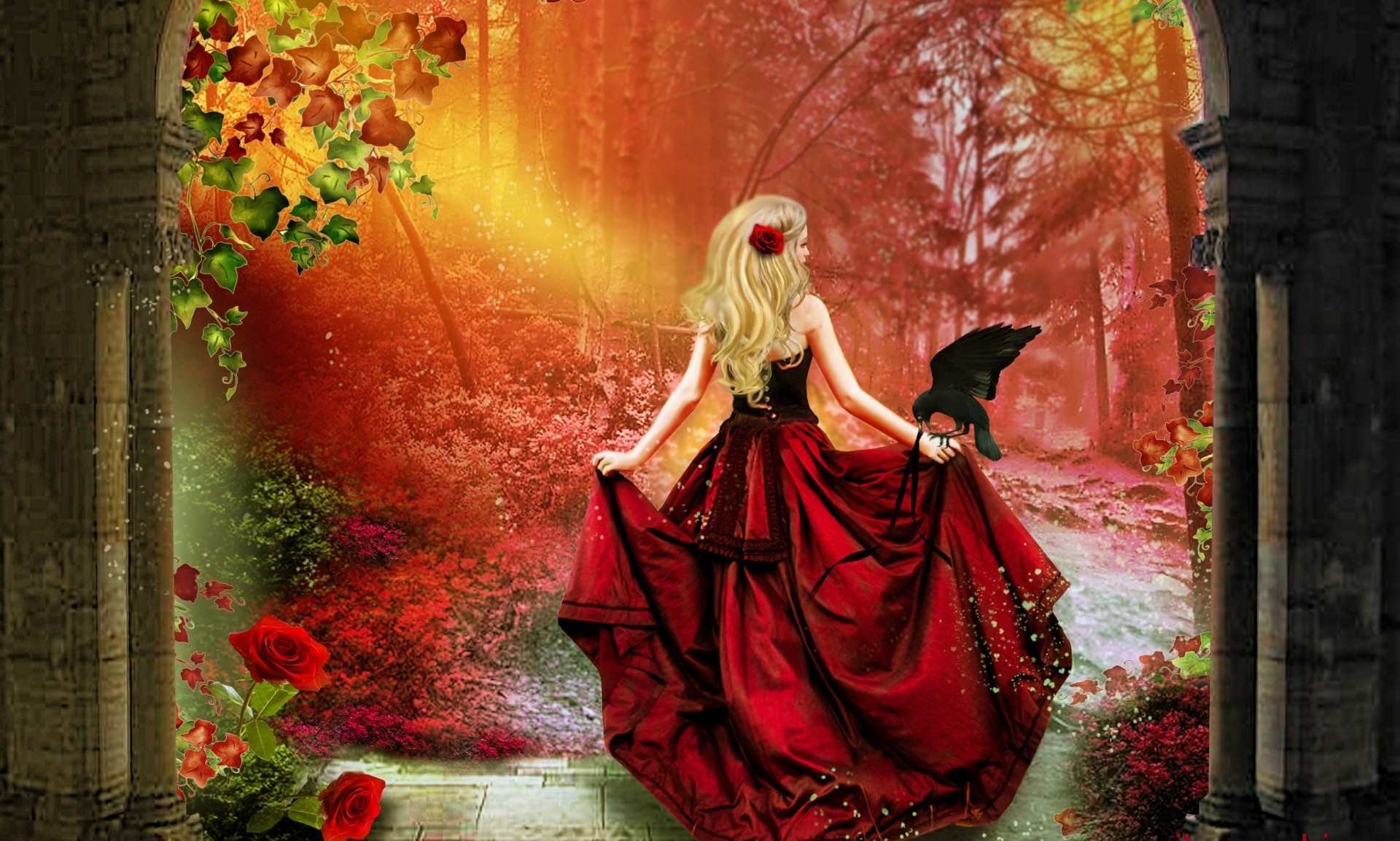 Fantasmagoría. Chica en vestido rojo en el bosque