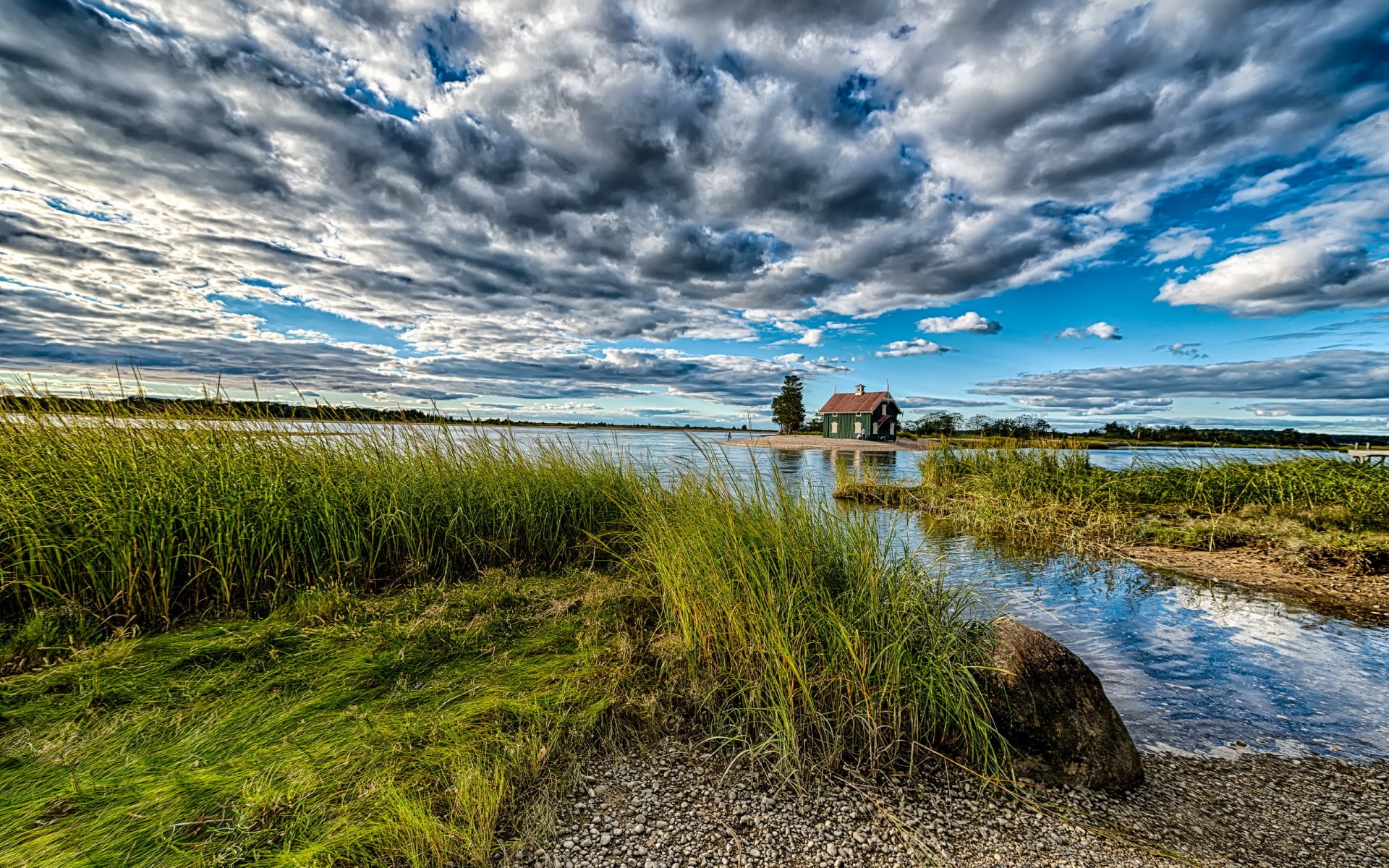 Un tren viaja a lo largo de un lago en el que se reflejan las nubesUn tren viaja a lo largo de un lago en el que se reflejan las nubes
