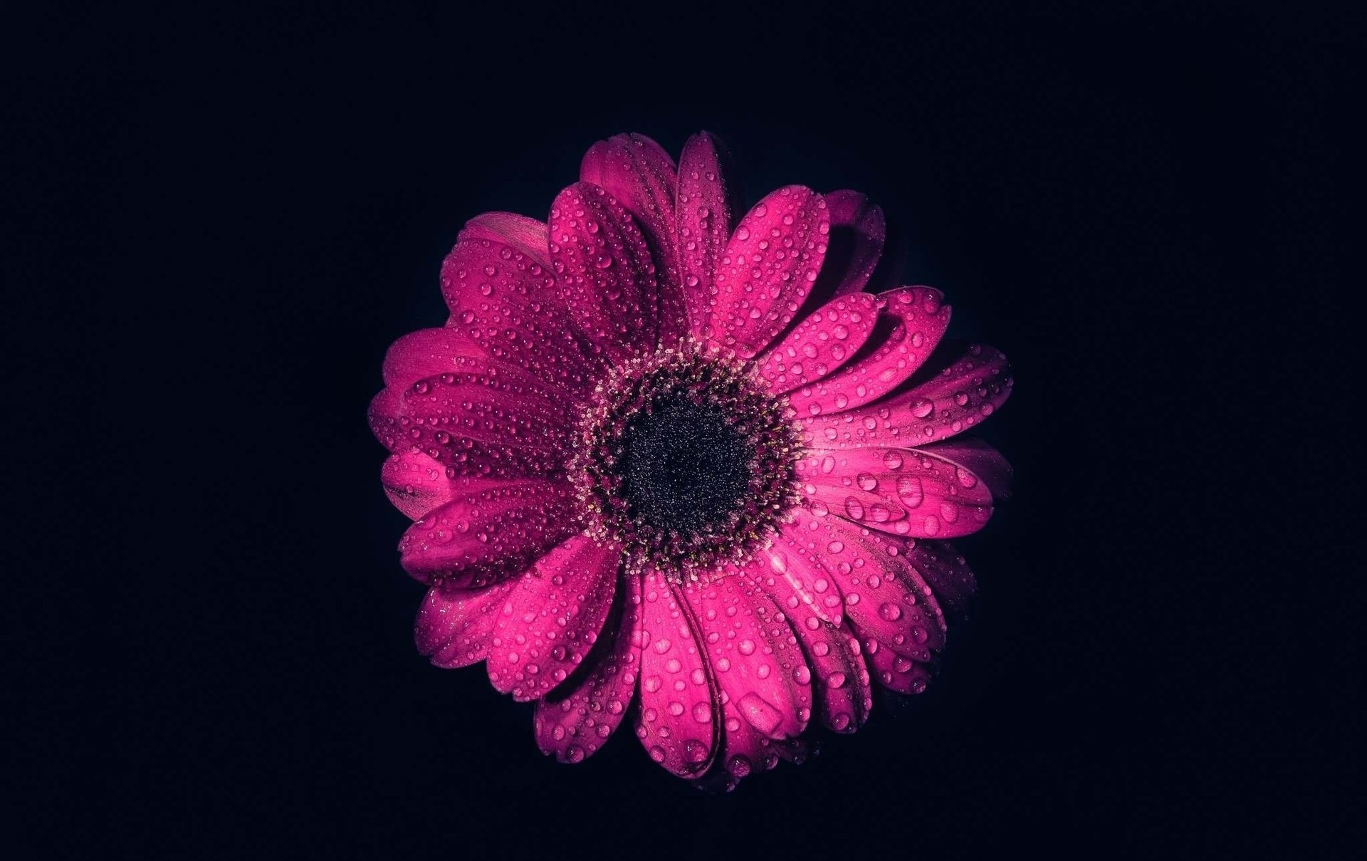 Fotografía macro de una gota de rocío en un pétalo de flor rosa