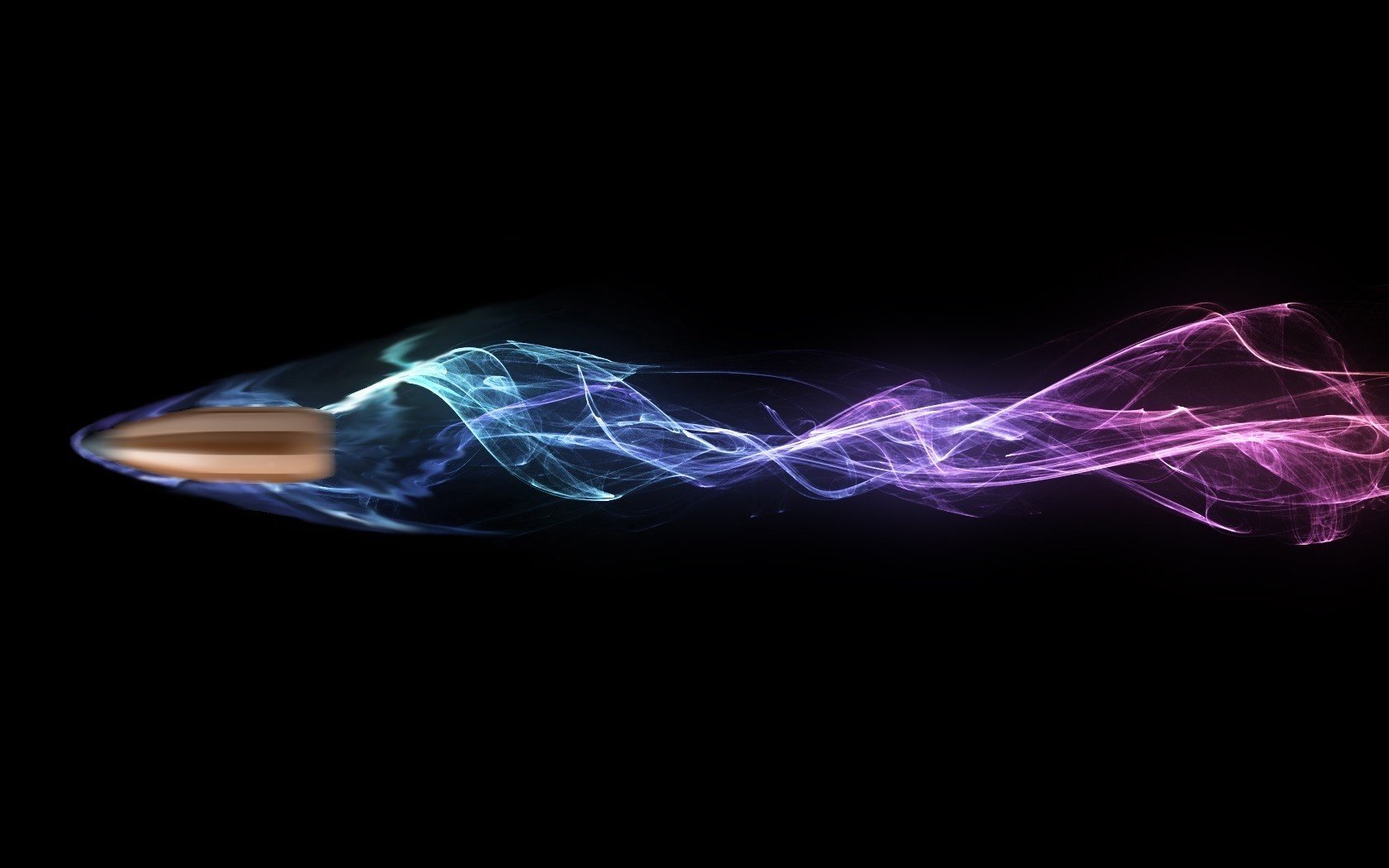 Sobre un fondo negro, una bala voladora con un rastro multicolorSobre un fondo negro, una bala voladora con un rastro multicolor