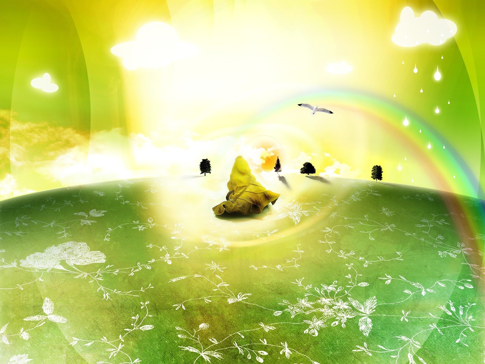 Dibujo abstracto del arco iris, nubes sobre fondo verdeDibujo abstracto del arco iris, nubes sobre fondo verde