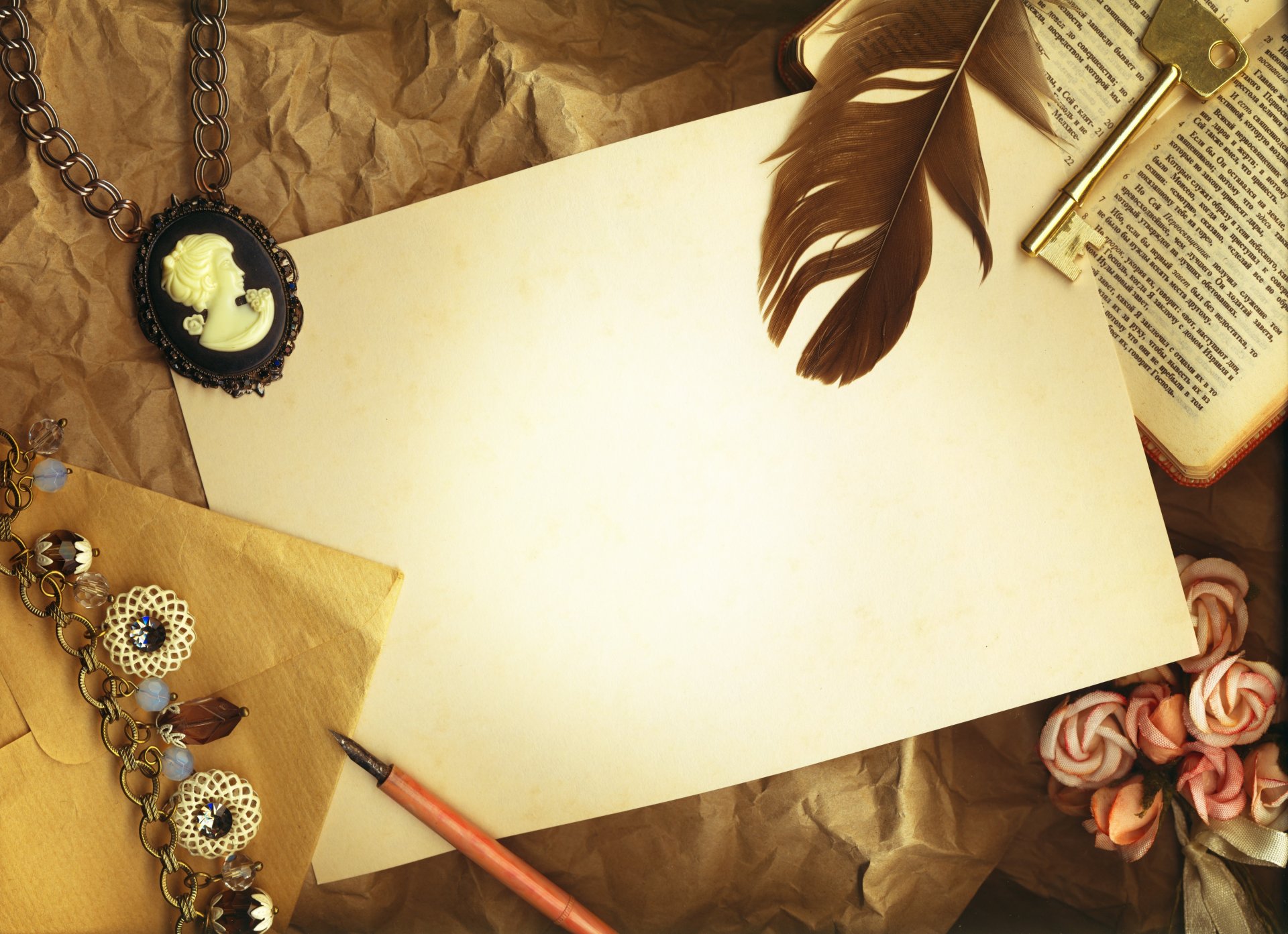 Papel blanco en blanco, libro, pluma, cameo y clavePapel blanco en blanco, libro, pluma, cameo y clave