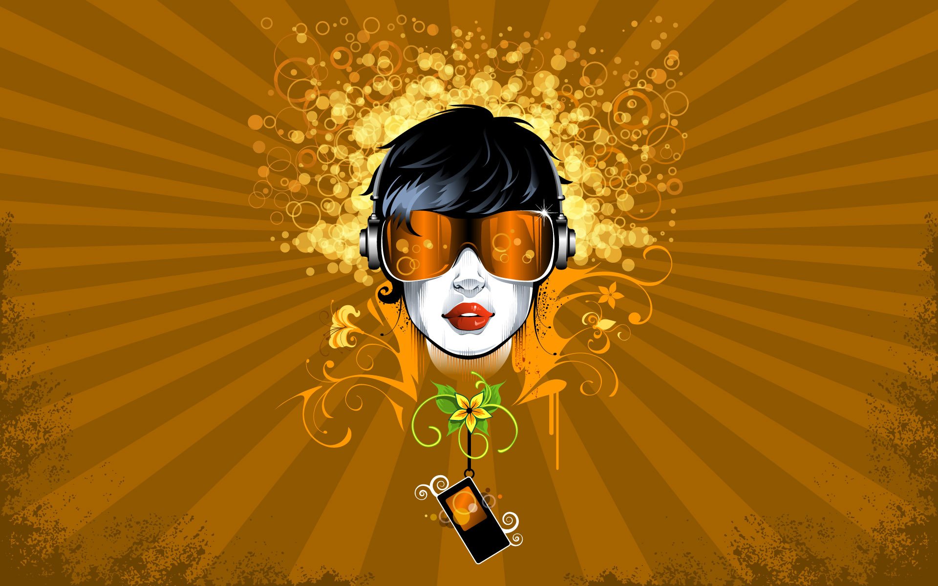 Dibujo abstracto con cabeza de modelo con gafas y reproductor walkmanDibujo abstracto con cabeza de modelo con gafas y Reproductor walkman