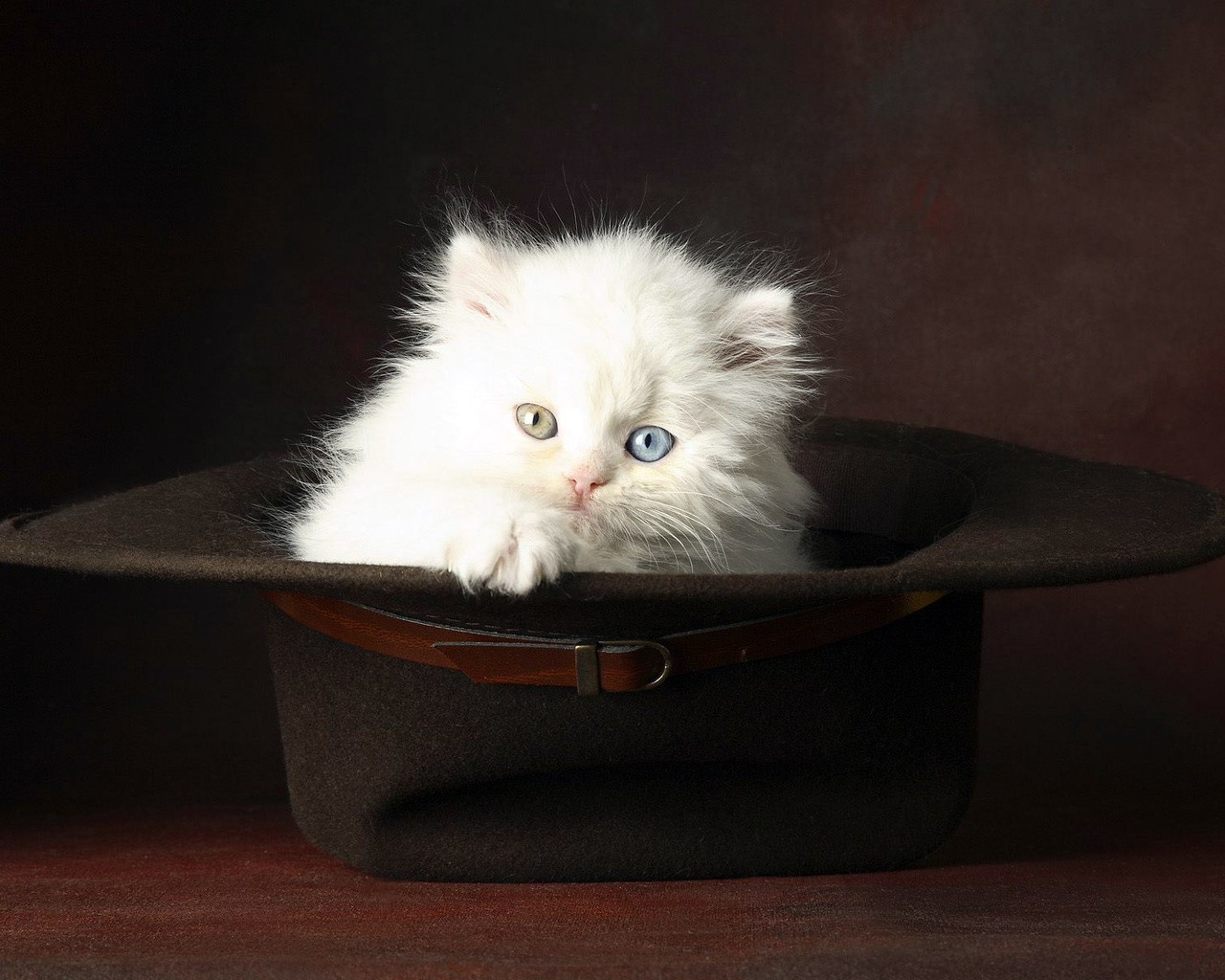 Gatito blanco peludo sentado en un sombrero