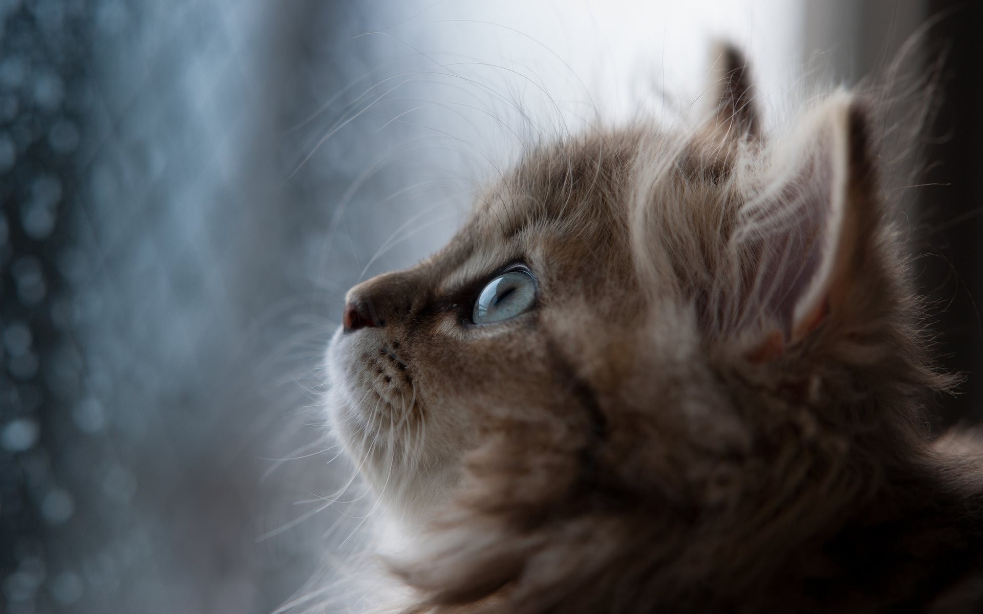 Pequeño gatito rayado mirando hacia arriba