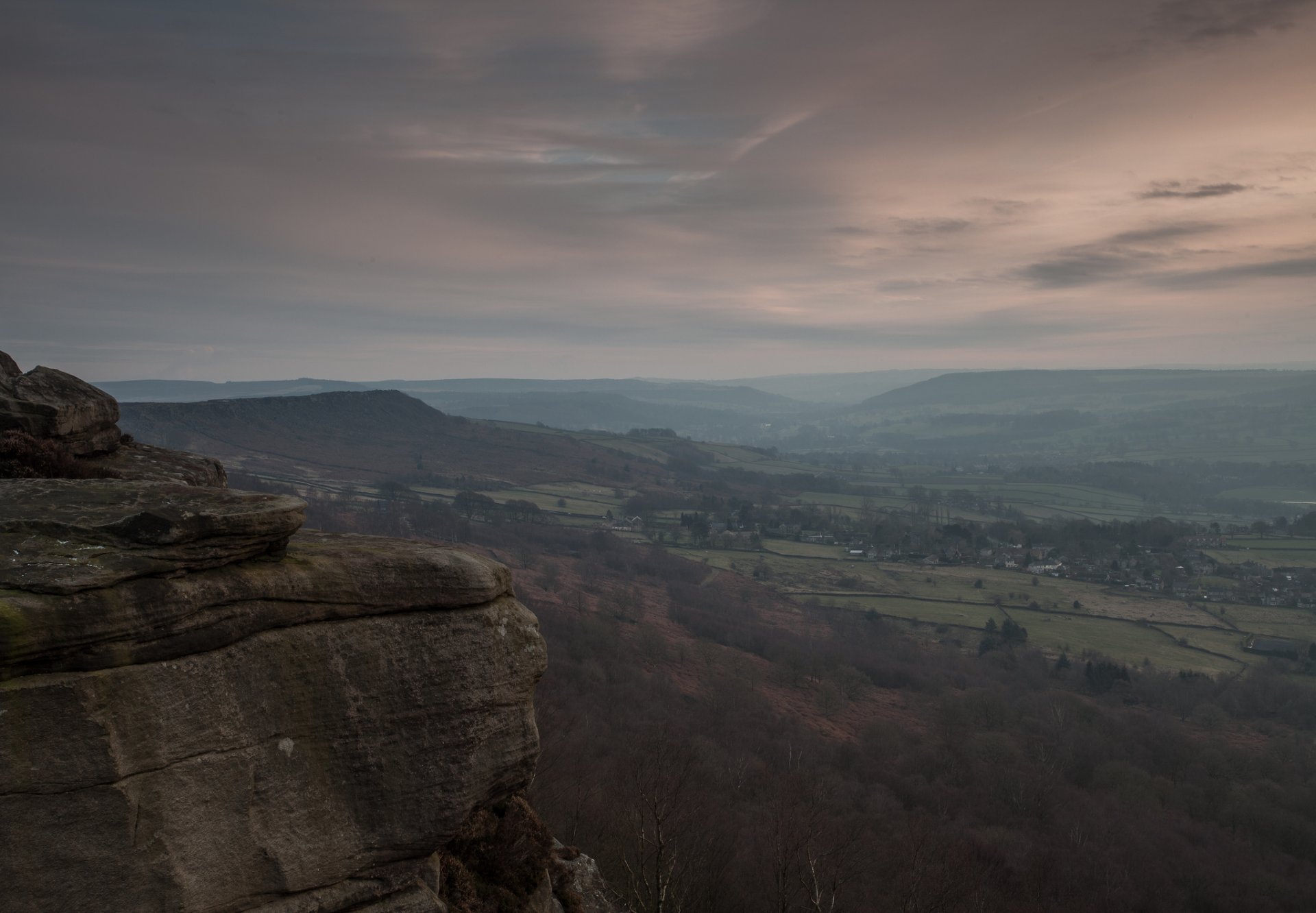 Cielo naranja durante la puesta del sol, valle con hierbaCielo naranja durante la puesta del sol, valle con hierba
