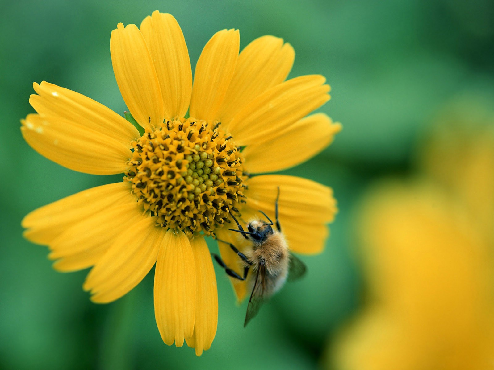 Recolección de polen en la flor amarilla. Abeja trabajadora