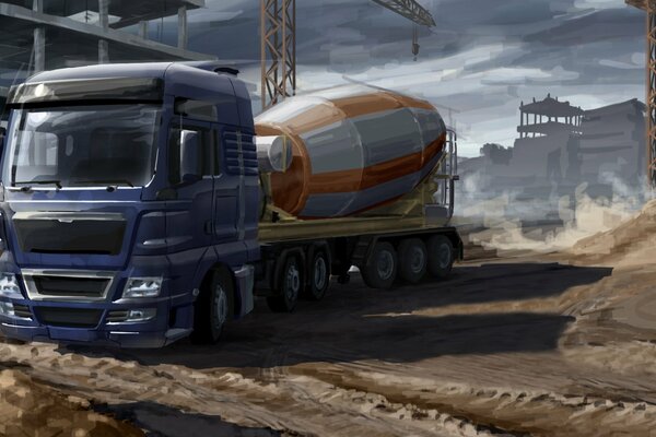 Mezclador de concreto amarillo a la velocidad en la carretera