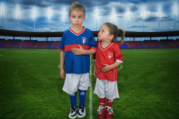 Niños pequeños en uniforme deportivo en el campo de fútbol