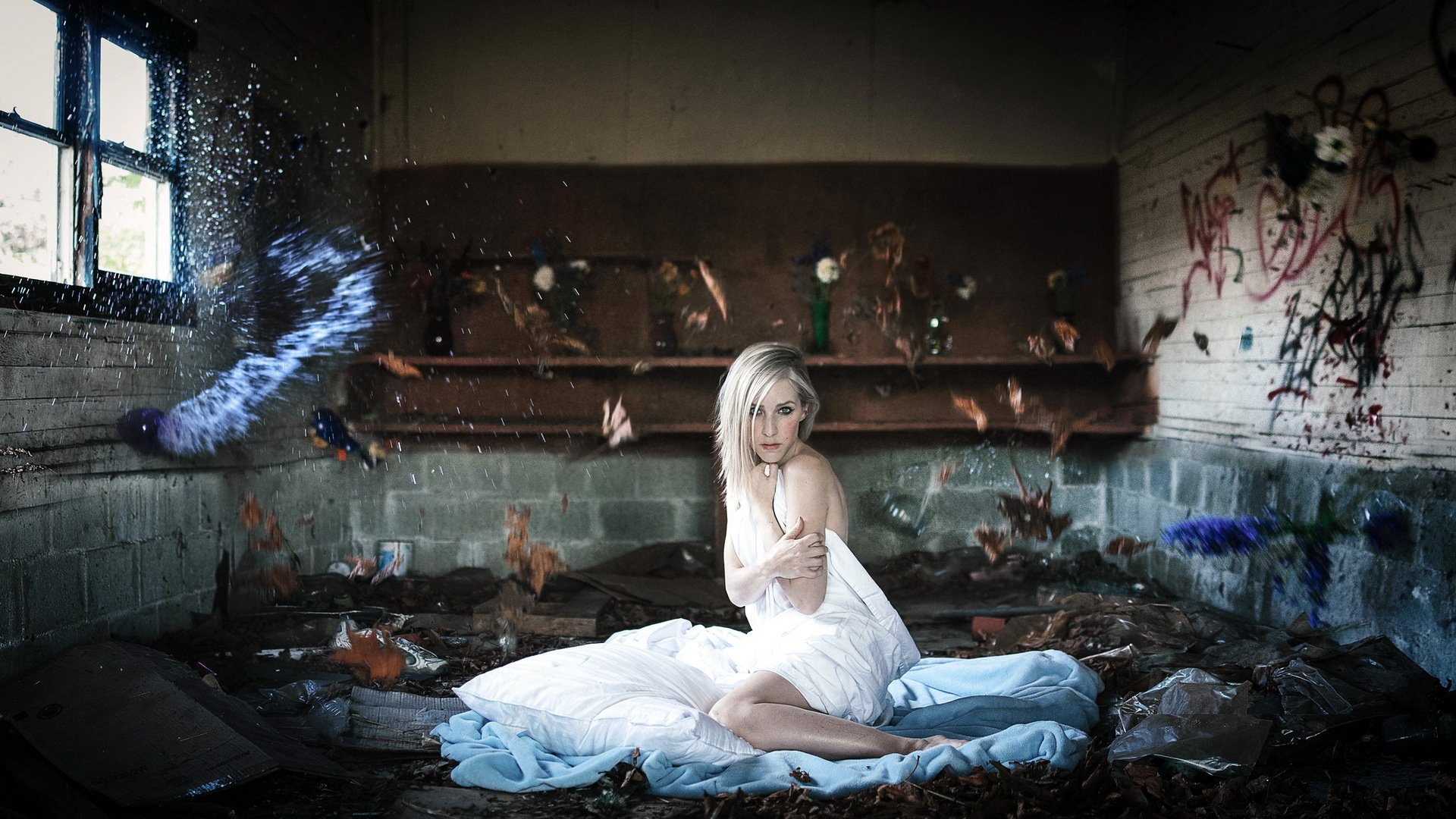 Una chica con un vestido blanco en una casa abandonadaUna chica con un vestido blanco en una casa abandonada