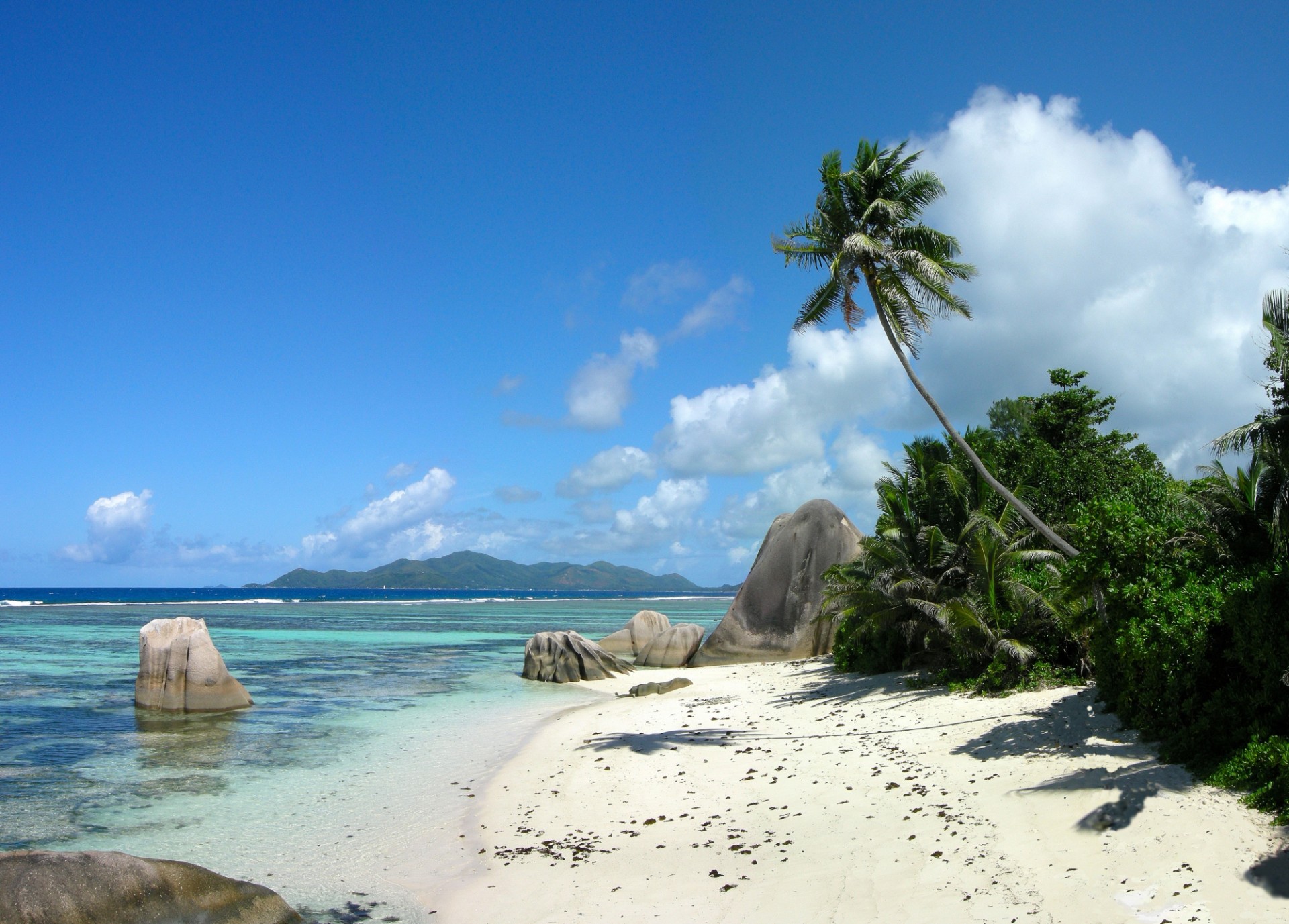 Costa del océano con palmeras y cielo azul